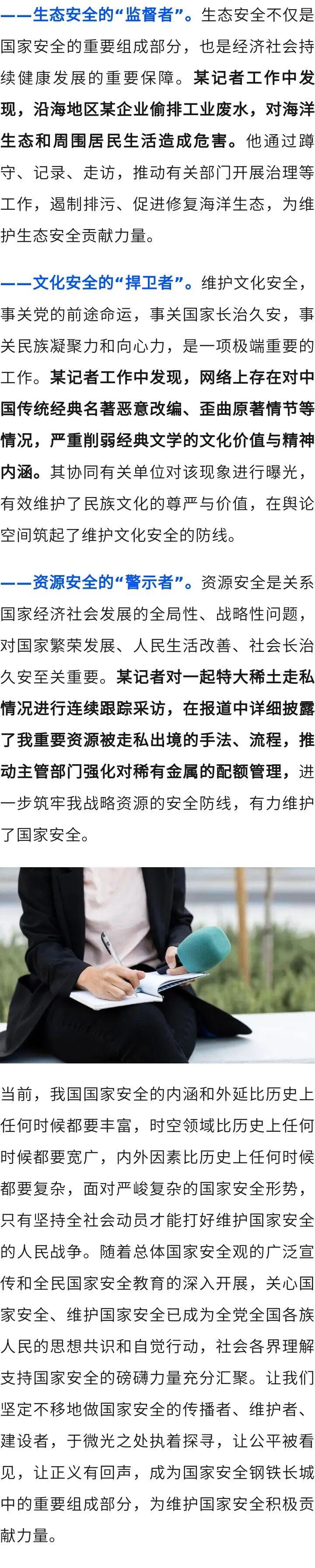 12月13日,“国家安全部”微信公众号发文表示,在信息爆炸的时代,国家安全的防线早已突破传统疆域,覆盖到舆论引导、真相揭露、民生福祉的每一个角落。作为时代的记录者、勇毅的发声者,一批优秀的中国记者或间接或隐蔽地为国家安全筑起一道无形屏障,将国家安全的防线延伸到笔锋流转与光影记录之中。