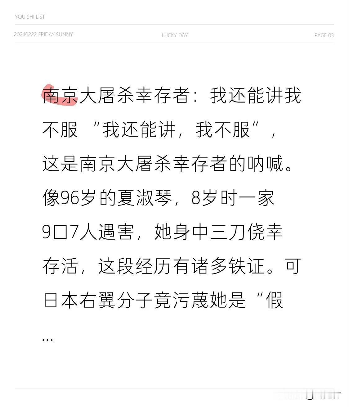 南京大屠杀幸存者:我还能讲我不服 南京大屠杀幸存者:我还能讲,我不服 “我还能讲,我不服”,这是南京大屠杀幸存者发出的呐喊。96岁的夏淑琴,8岁时一家9口7人遇害,她身中三刀侥幸存活,这段经历有诸多铁证。可日本右翼分子竟污蔑她是“假证人”,她毅然跨国起诉并胜诉。 然而80年过去,日本政府仍不承认南京大屠杀,也不道歉。幸存者不服,一是怕记忆被时间冲淡,真相被淡忘;二是不甘只被当作悲情符号。只要一息尚存,他们就要夺回生命定义权,期盼日本政府能正视历史。这呐喊振聋发聩,值得每个人铭记。 侵华日军大屠杀 南京大屠杀 日本鬼子大屠杀 上海南京大屠杀