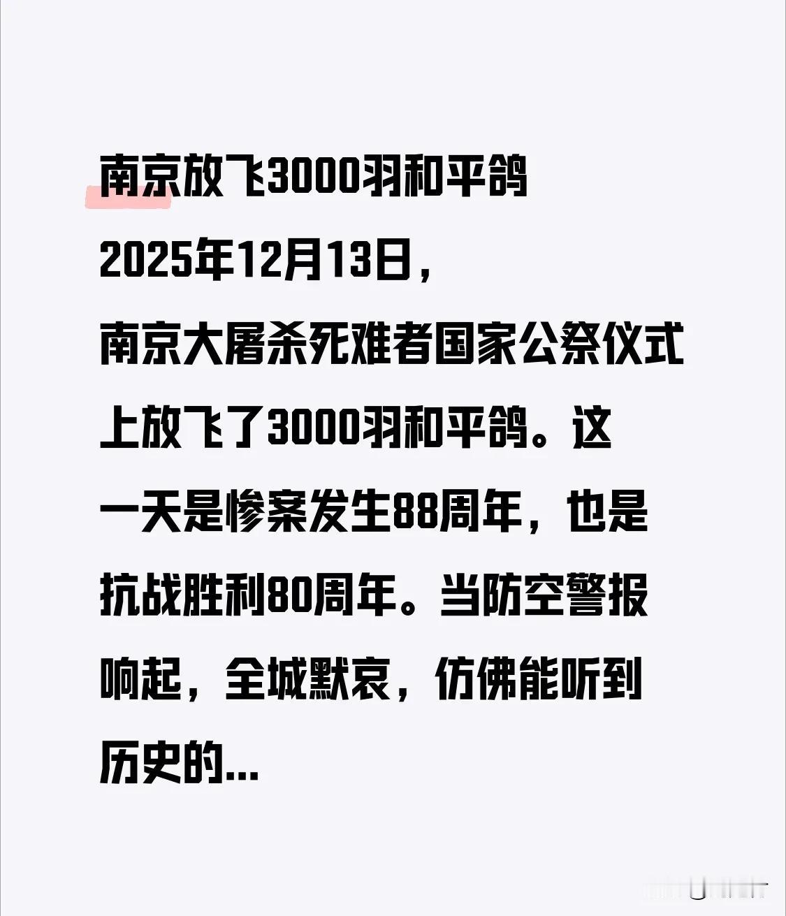 南京放飞3000羽和平鸽 2025年12月13日,南京大屠杀死难者国家公祭仪式上,3000羽和平鸽振翅高飞。这一天,既是惨案发生88周年,也是抗战胜利80周年。防空警报响起,全城默哀,历史的悲叹似在耳畔回响。 现场,88名青少年代表诵读《和平宣言》,240字的宣言满含对和平的渴望。这一年,又有8位幸存者离世,他们带着伤痛远去,但历史不容忘却。放飞的和平鸽,是对逝者的告慰,亦是对和平的祈愿。我们当铭记历史,让和平之声永续流传。 南京大屠杀 上海南京大屠杀 反人类大屠杀 国祭日南京 中国和平鸽