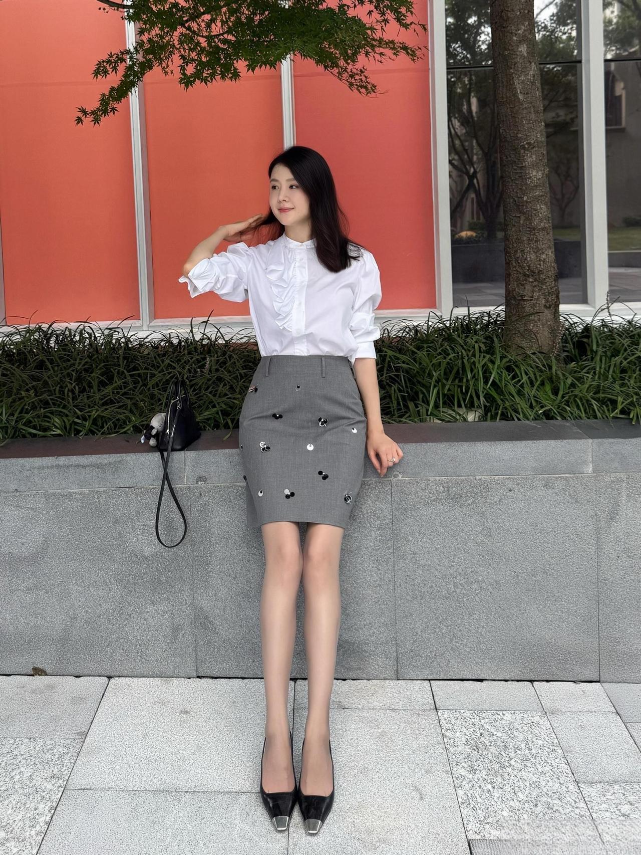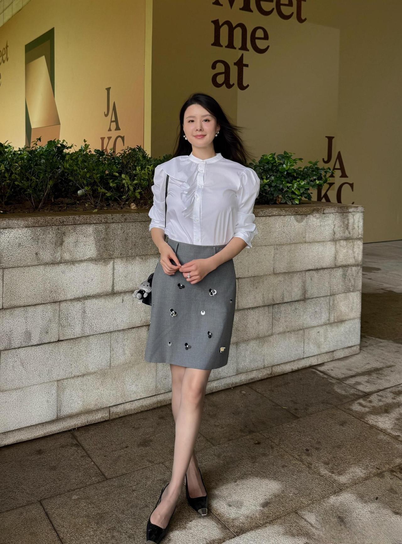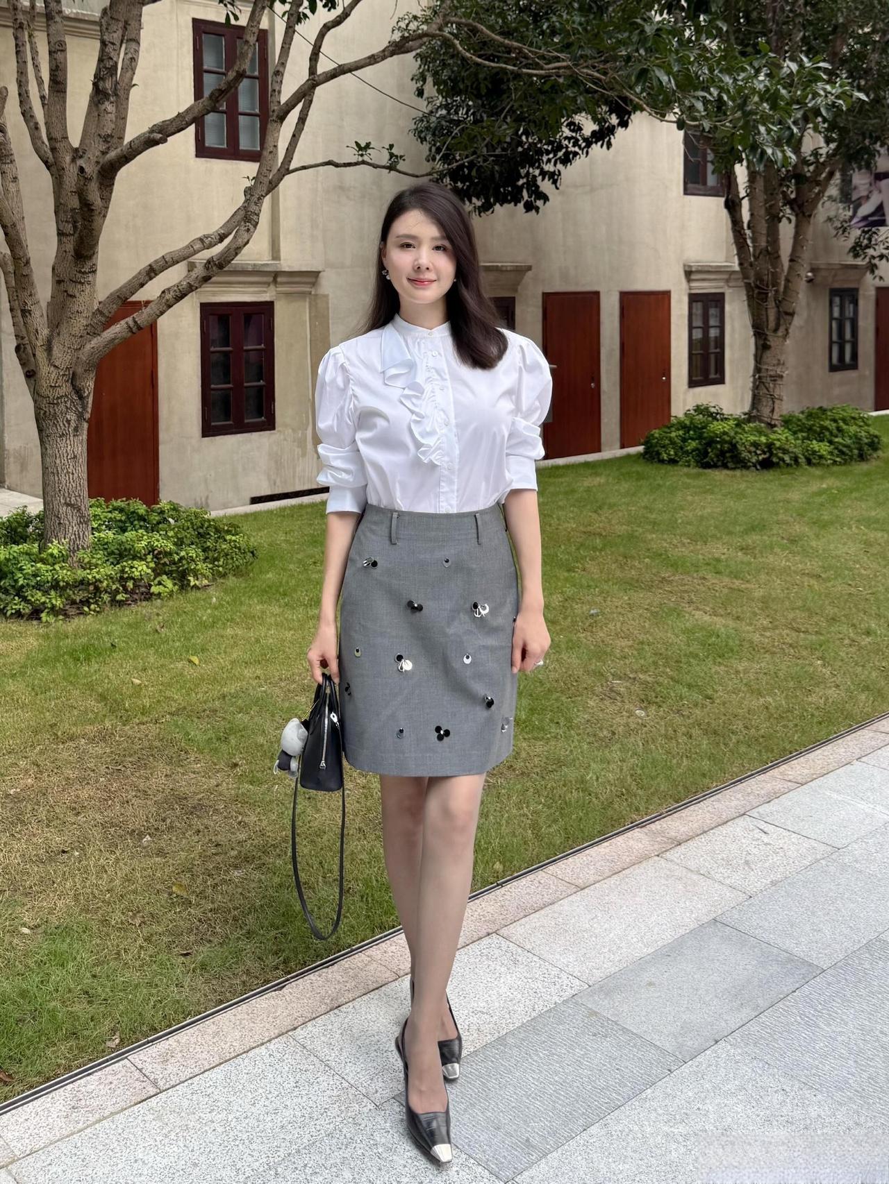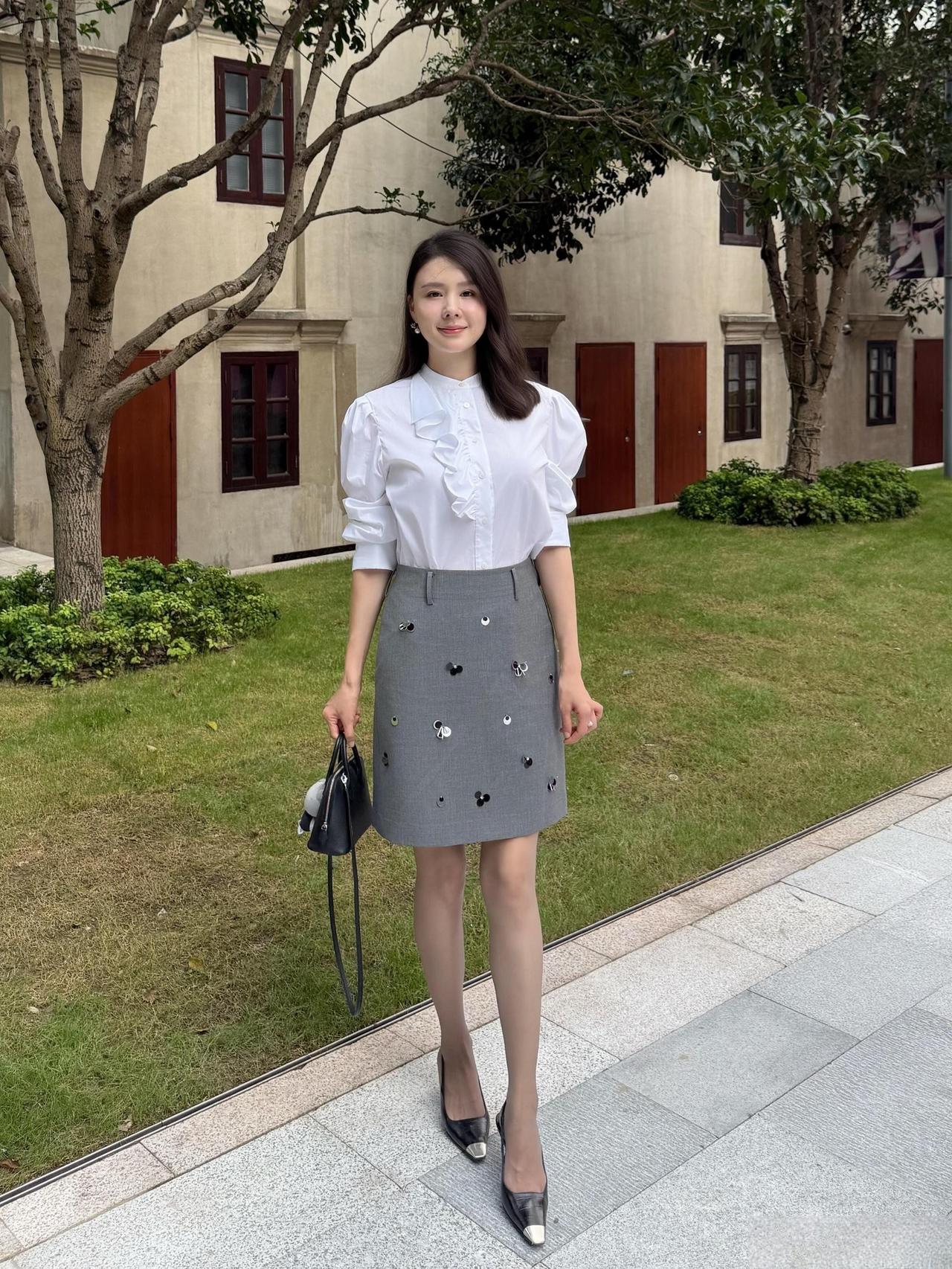 这套穿搭是优雅甜美的轻复古少女风,精致又带灵动细节。白色泡泡袖衬衫自带复古宫廷感,荷叶边装饰注入甜美元素;灰色短裙上的立体装饰(类似小蝴蝶结/爱心)是点睛之笔,让简约裙装多了少女趣味,整体风格优雅又减龄。 搭配黑白拼色尖头鞋精致干练,与衬衫的优雅感呼应;简约黑包平衡了甜美元素,让整体风格更日常得体。温柔风穿搭衬衫 职场穿搭 什么样的穿搭可以成为气质女神?