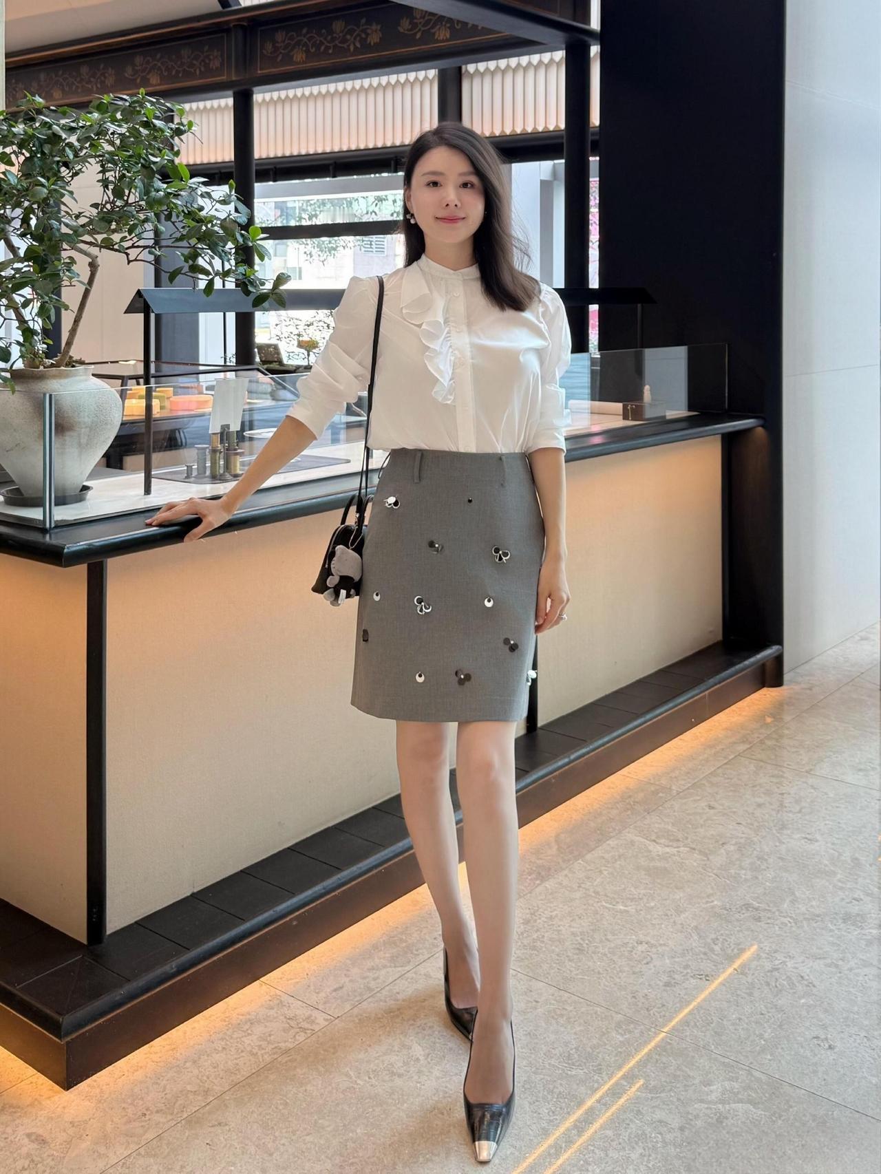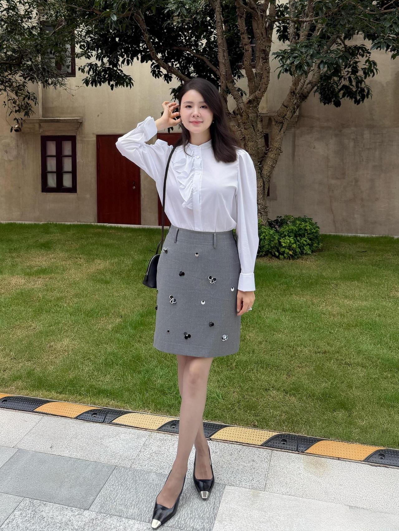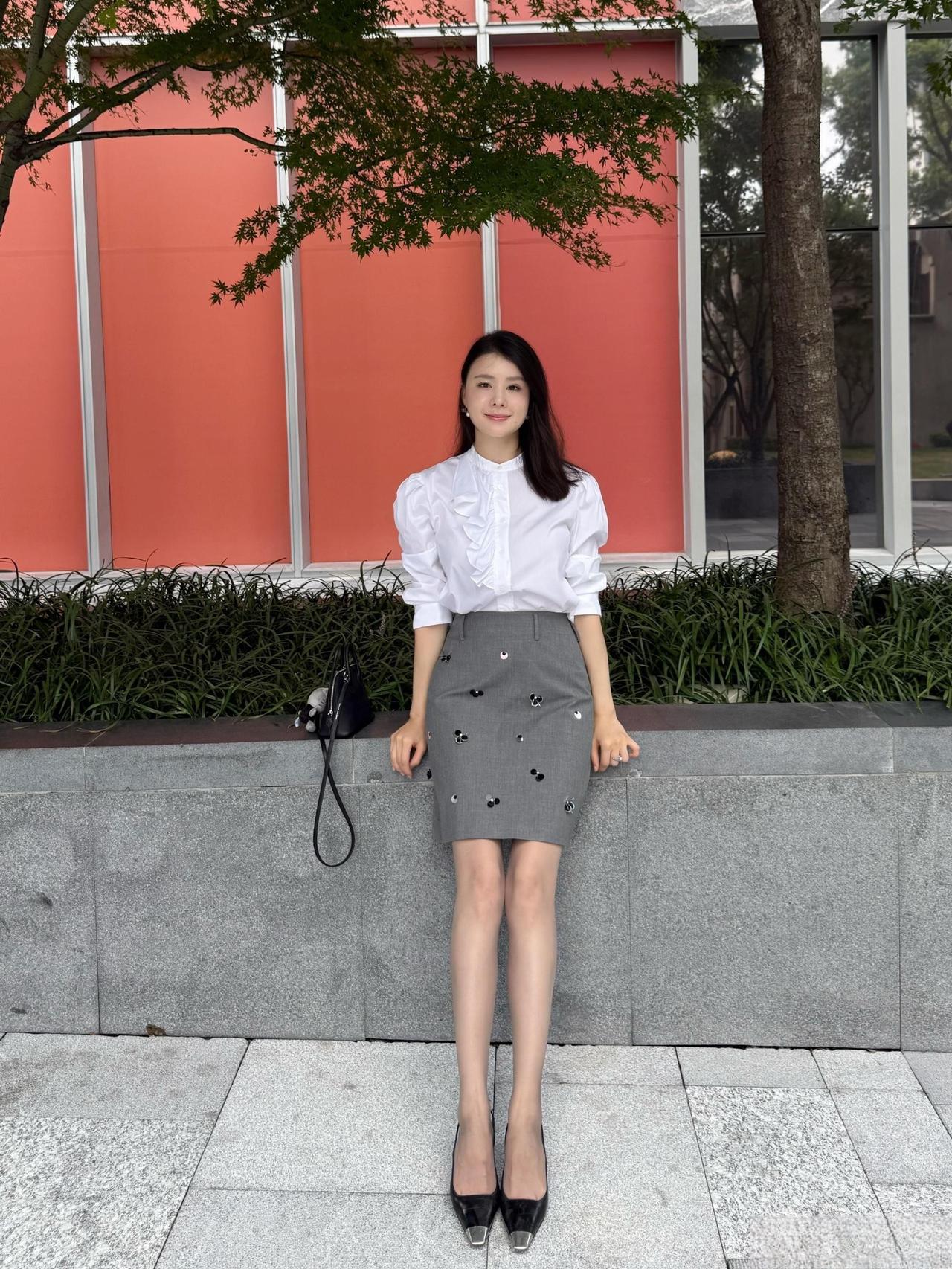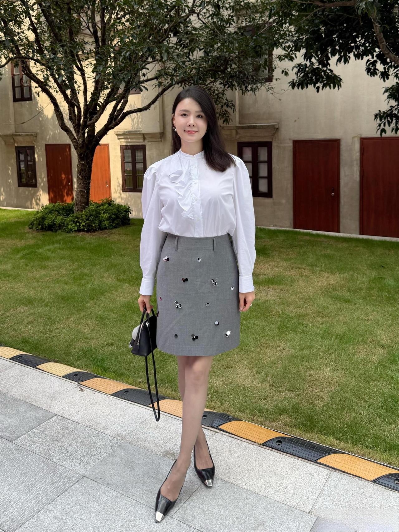 这套穿搭是优雅甜美的轻复古少女风,精致又带灵动细节。白色泡泡袖衬衫自带复古宫廷感,荷叶边装饰注入甜美元素;灰色短裙上的立体装饰(类似小蝴蝶结/爱心)是点睛之笔,让简约裙装多了少女趣味,整体风格优雅又减龄。 搭配黑白拼色尖头鞋精致干练,与衬衫的优雅感呼应;简约黑包平衡了甜美元素,让整体风格更日常得体。温柔风穿搭衬衫 职场穿搭 什么样的穿搭可以成为气质女神?