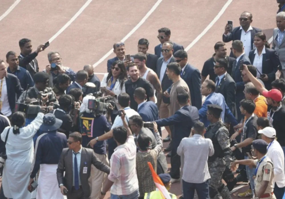官员家属围住梅西,后来很多观众不满意开始骚乱,直接跳过围栏下球场想近距离接触,治安开始变差,人数太多也拦不住,策划怕出大事就安排退场,毕竟球王在印度出事这个锅他背不起。