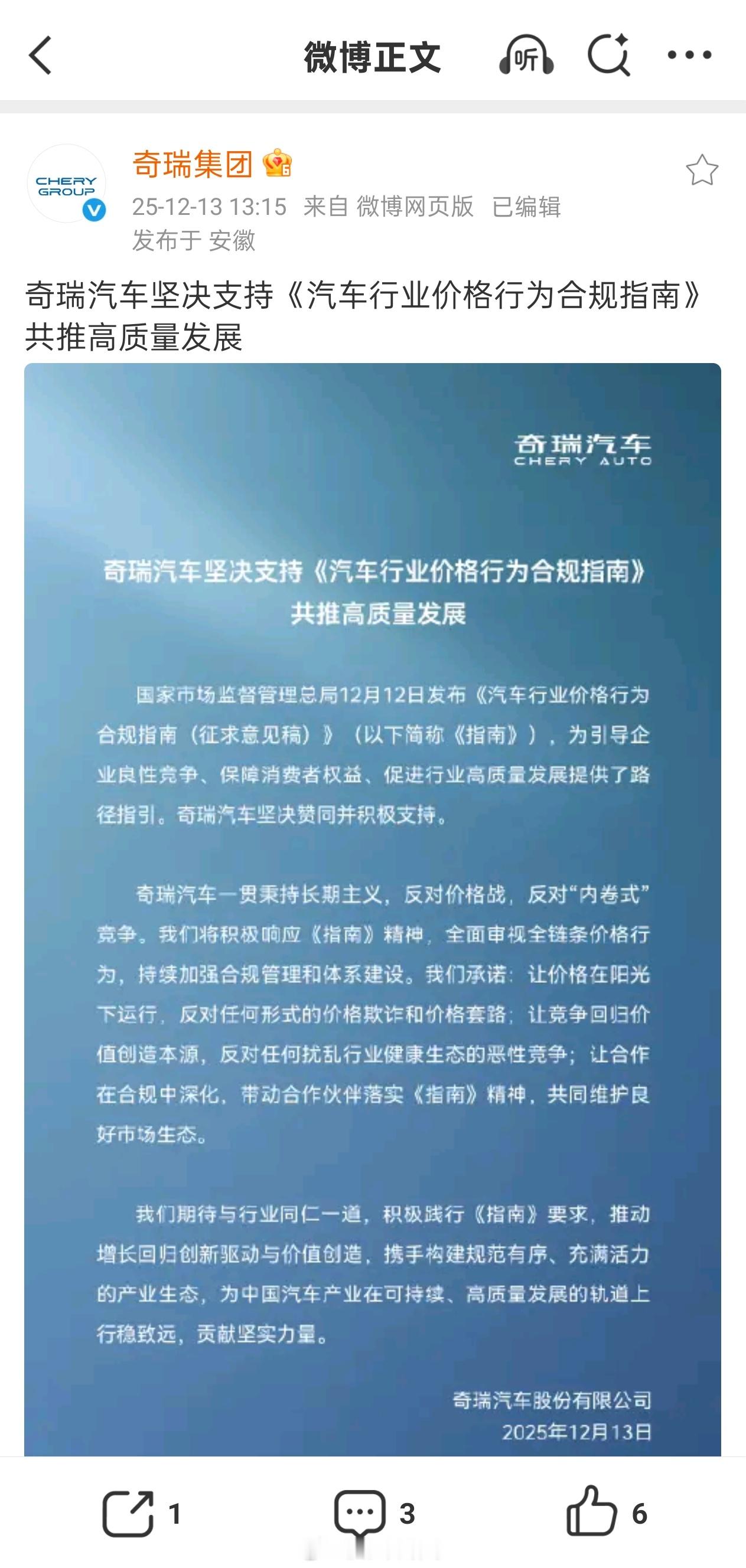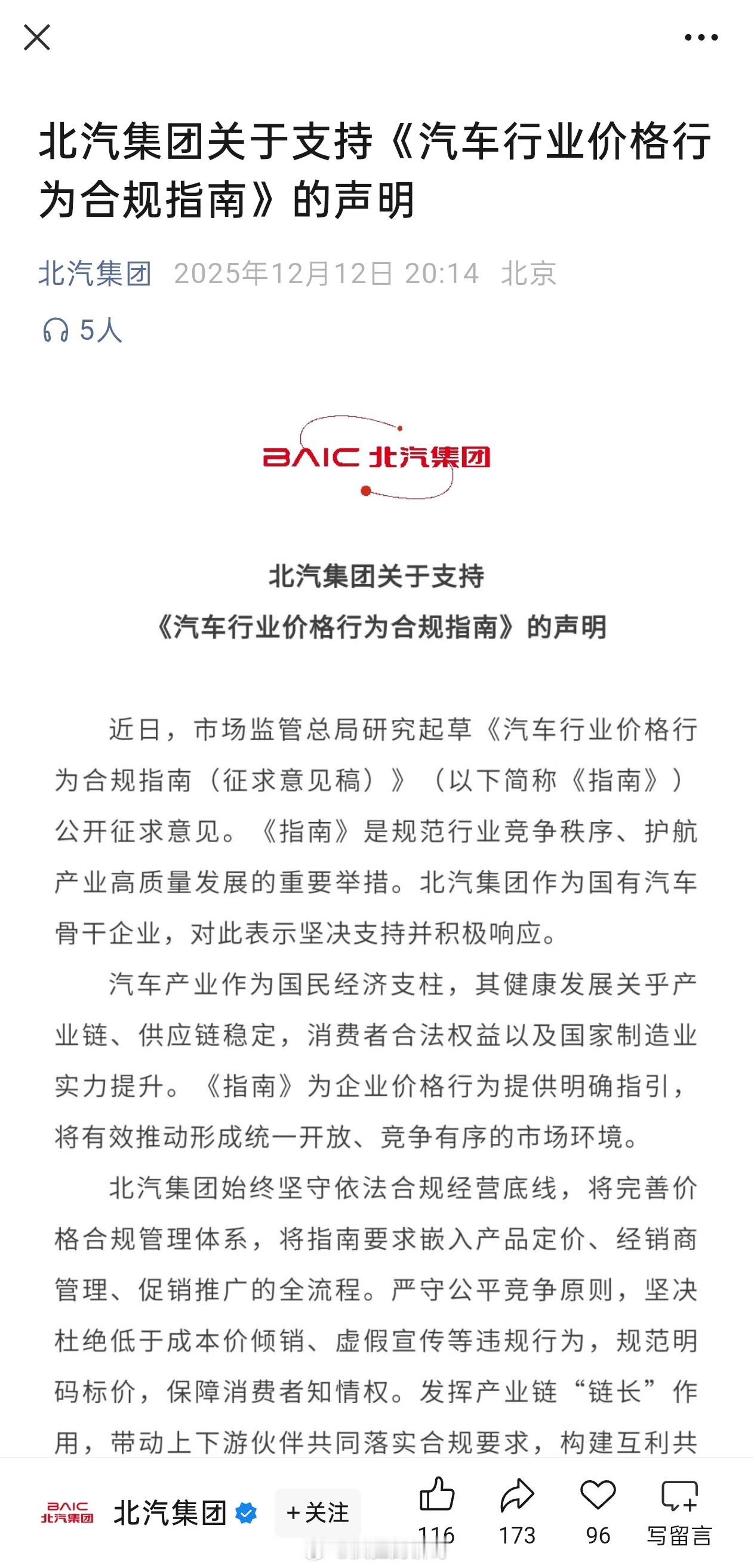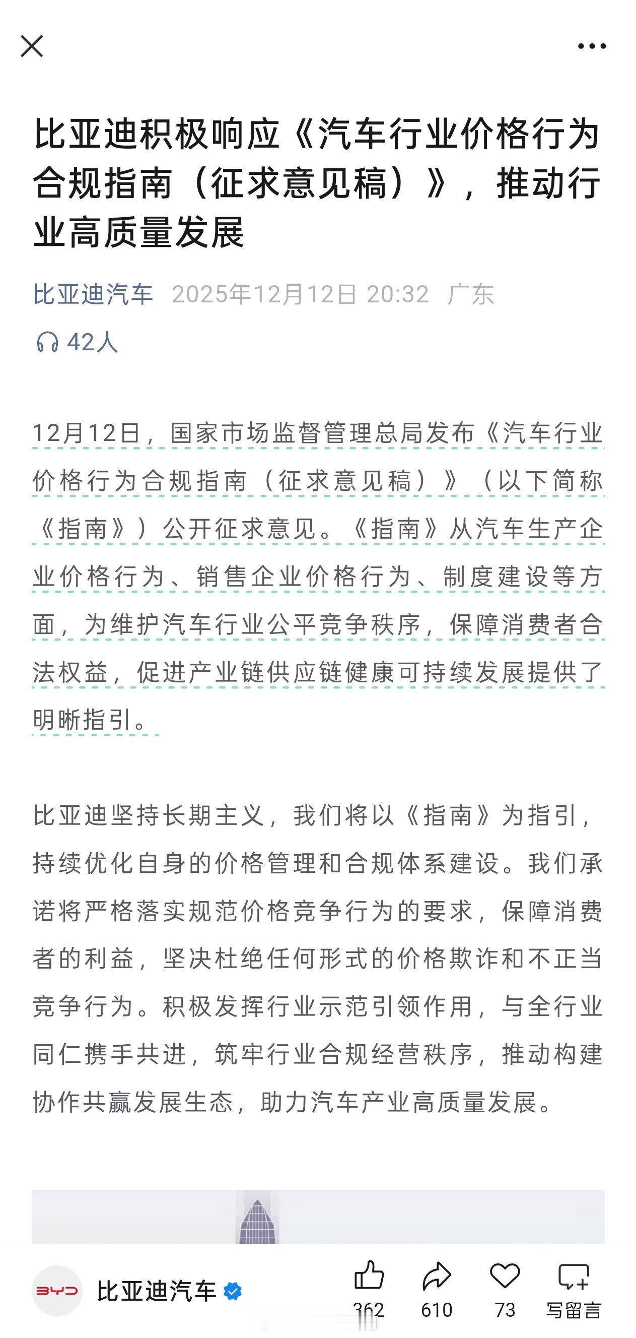 小鹏、比亚迪、北汽、奇瑞等多车企表态支持汽车行业价格行为合规指南,我专门去下载看了下这份文件,感觉就是在给汽车行业立价格规矩:车企、4S店、平台都别乱降价、掀起低价倾销、别搞价格套路、别欺骗消费者,谁玩价格战、假促销、暗箱操作,风险都很大。最近汽车行业价格太乱了有的车卖得比成本还低有的优惠全是套路有的厂家在“卷死同行”,国家出手要求卖车须明码标价,你可以竞争,但不能乱来、不能违法、不能忽悠消费者。对付费解锁、软件收费也点名了,防的就是你买车便宜,用车被割!有免费期的,要说清楚!免费啥时候结束,以后怎么收费!没提前说清楚的功能,不能事后收费!另外不是很多等车的吗?现在国家出手要求卖车提前告知交付时间,不能现场交付车辆的,要在交易前明确告知交付时间!那么接下来你会看到的变化可能是:极端低价会变少!车企价格更透明!靠“暗补、假优惠”的玩法会越来越难!大v聊车汽场全开