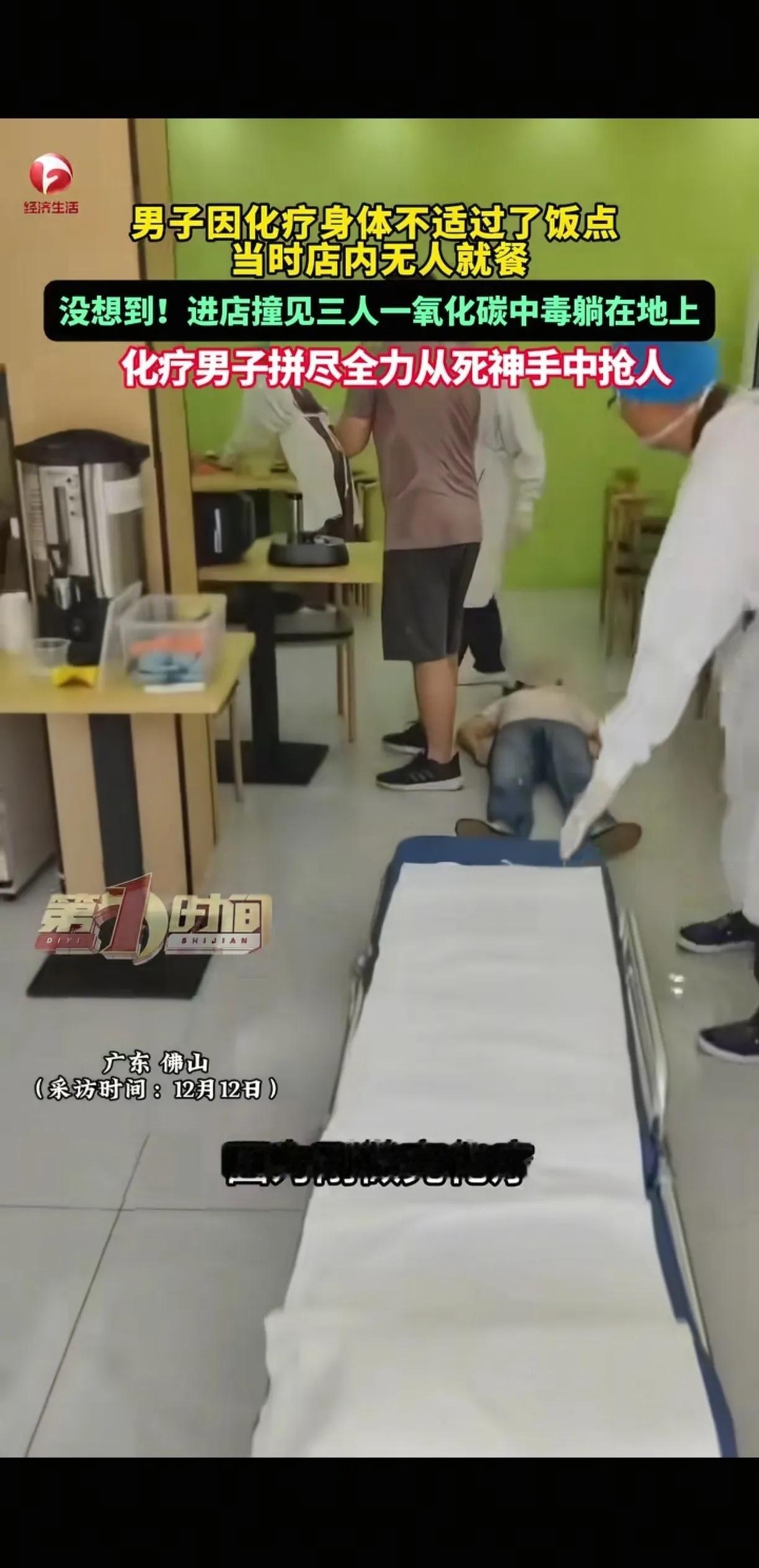 广东佛山,潘先生在医院化疗,身体不舒服,下午两三点才去肠粉店吃饭。正是这次错过饭点儿,竟然救了三条命。 潘先生推门进肠粉店时,店内空无一人,只看见老板和两名员工横躺在地上,毫无动静,他心里一紧,立刻意识到是出了大事。 他忍着化疗后的身体不适,快步上前查看,发现三人是一氧化碳中毒,后厨里还摆着三个煤气罐,最里面的那个阀门压根没关,煤气还在往外漏。 他顾不上头晕乏力,先冲过去拧紧煤气罐阀门,又把店里的门窗全部打开通风,接着掏出手机拨打120和119,说话时都因为缺氧有些喘不上气。 急救人员赶到后,迅速把三人抬上担架,潘先生站在一旁,看着担架被推走,才扶着墙缓缓蹲下,化疗后的虚弱感此刻全涌了上来。 事后潘先生回忆,要是自己按正常饭点来,说不定也会跟着中毒,偏偏这次晚到的巧合,让他成了从死神手里抢人的人。 老板康复后,带着水果和一面写着“救命之恩,永生难忘”的锦旗登门感谢潘先生,紧紧握着他的手,红着眼眶说要不是他,自己和员工早就没了。 潘先生只是摆了摆手,说这是碰巧遇上的小事,让老板以后多检查煤气罐,别再出这样的危险,朴实的话里满是善意。 要不要我帮你整理一份餐饮场所燃气安全检查清单,让商家能避免类似的安全隐患 各位读者你们怎么看?欢迎在评论区讨论 来源:AHTV第一时间 2025-12-12采访