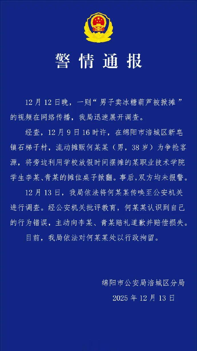 12月12日晚,一则“男子卖冰糖葫芦被掀摊”的视频在网络传播,我局迅速展开调查。