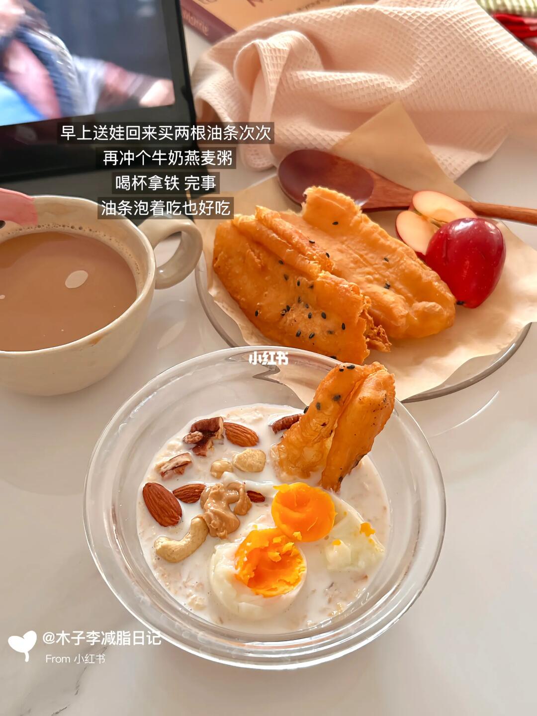 初始体重:120斤 今日体重:90斤 ↓30斤 、 🥣早:油条➕牛奶燕麦粥➕拿铁➕苹果🍎 🥣午:猪蹄花生汤➕西蓝花➕糙米饭 加:苹果➕一半欧包 🥣晚:肉夹馍➕桃酥 、 🈚运动 💧喝水2000ml - 早餐的尽头是中式 吃油条喝燕麦粥暖乎乎的不要太满足呀!今天的幸福是晚上的肉夹馍 饼酥酥的夹着肉又香,