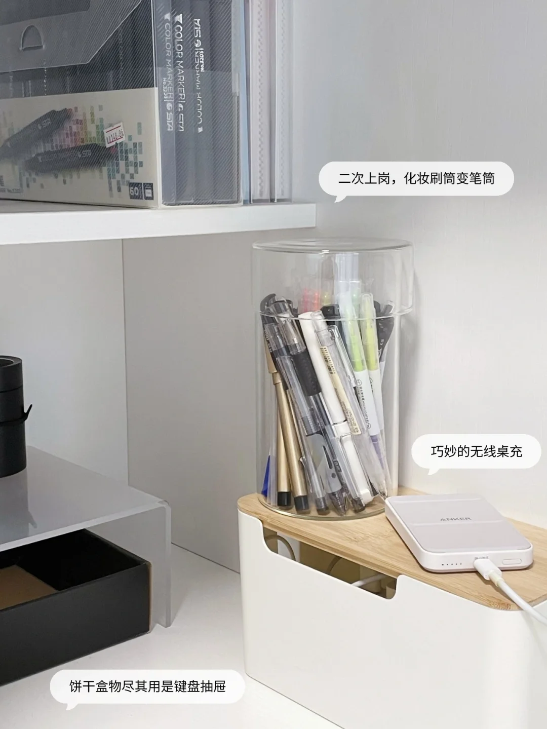 断舍离了化妆套刷,收纳刷桶再就业当笔筒,透明清晰可视,顶部有盖防尘,是我心中的完美笔筒。一物多用不浪费,值了。