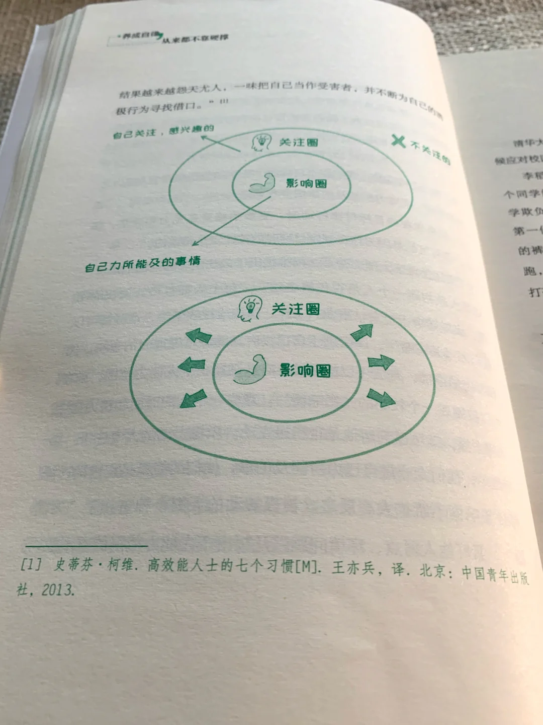 1. 我们在制定目标时要从个人的影响圈出发,做好力所能及的事情,让影响圈不断扩大,而不是寄希望于通过己之力,去解决自己无法掌控的关注圈中的问题,那样只能徒增烦恼。