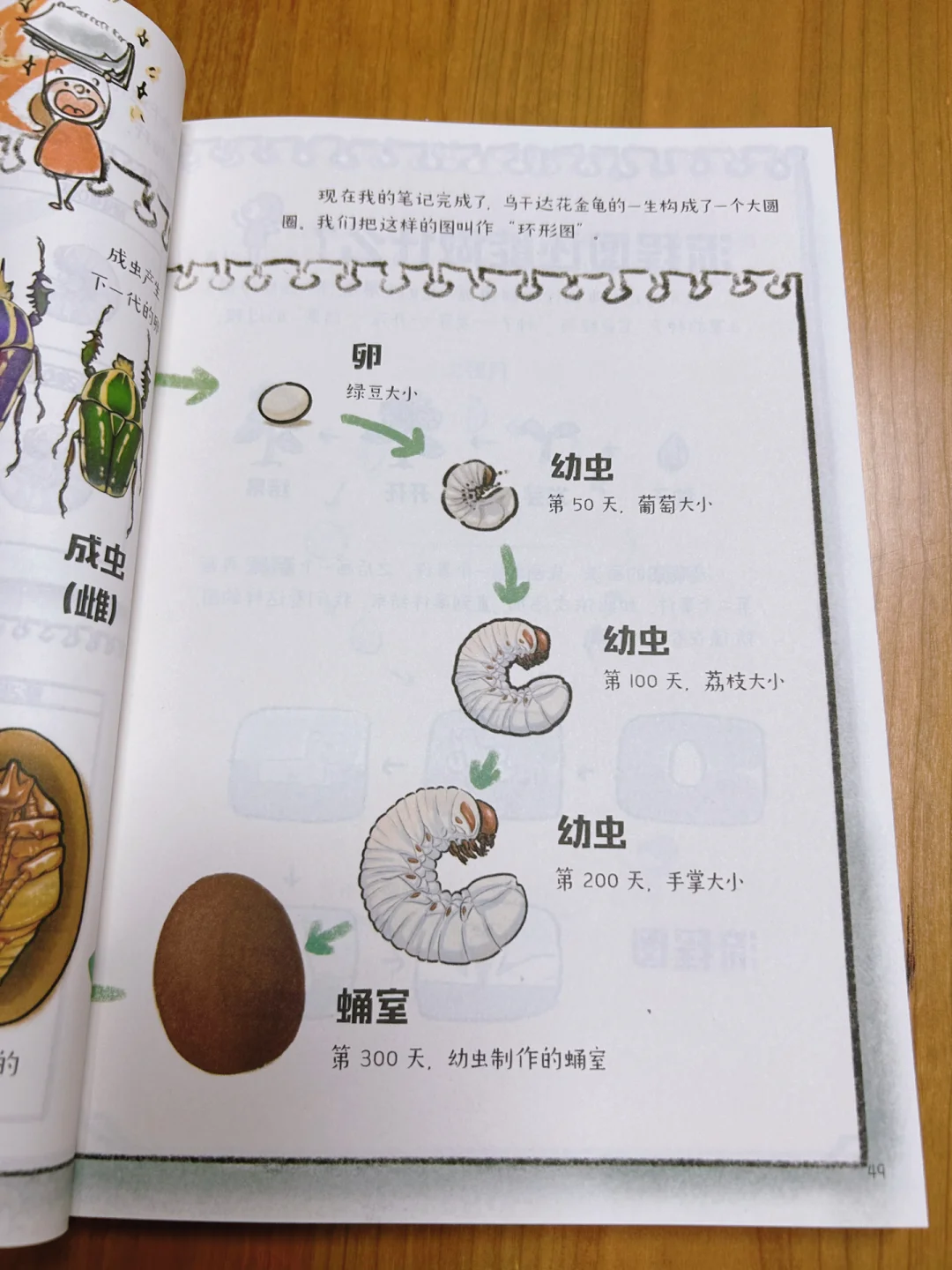 在探究神秘的卵中,把卵放在发酵的木屑里,观察够记录下并给卵画一张画。第15天发现卵不见了,出现了幼虫,查阅后它叫蛴螬(qí cáo),是金龟子的幼虫。第320天发现它变成了蛹,第360天变成了漂亮的成虫,叫做乌干达花金龟,在第390天的时候可以自由活动。把它生长的变化画成里环形图,这样的流程图可以用在多个地方。