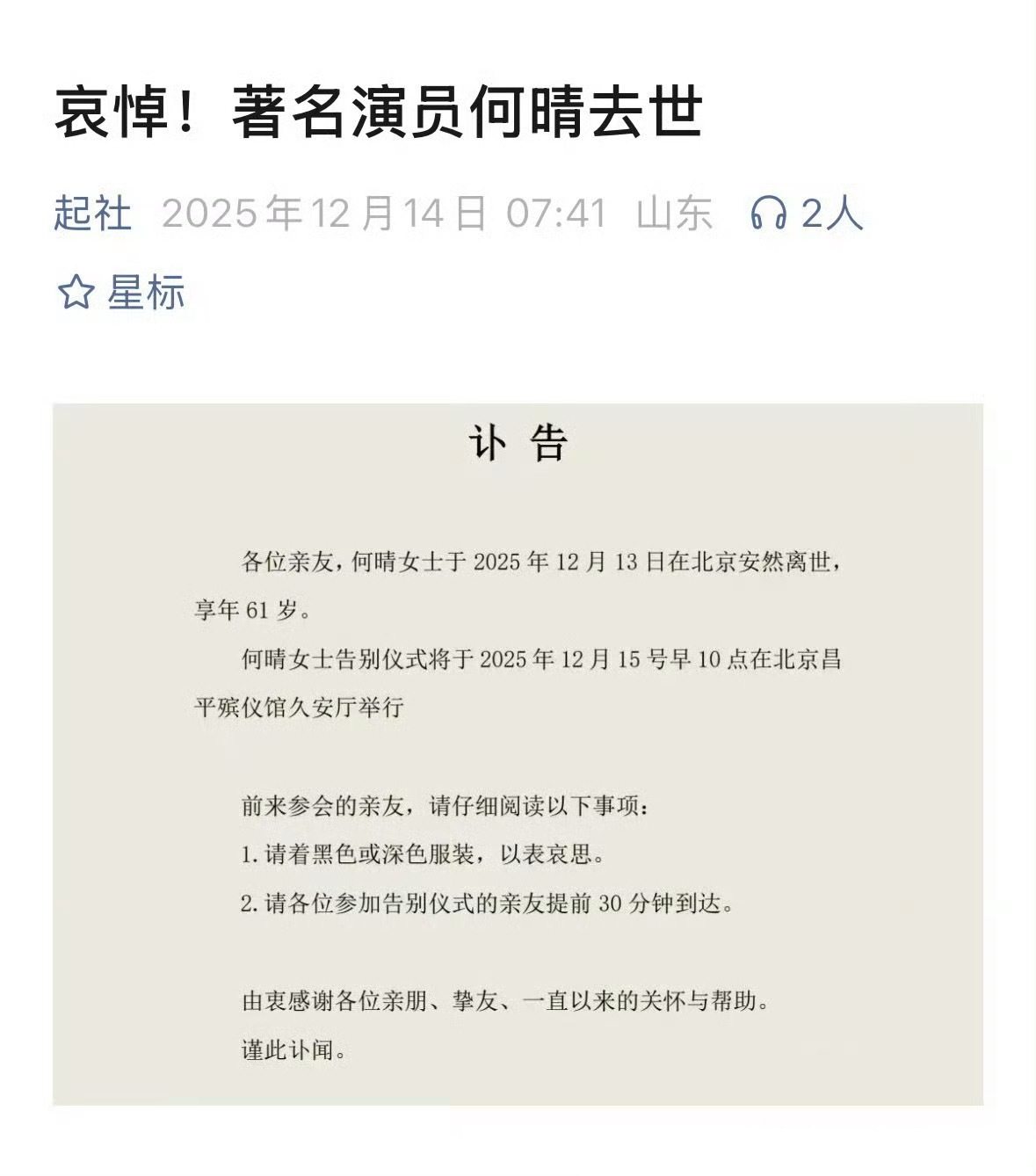 世事无常啊!何晴老师去世了,前几天我还评论她呢。12月13日,著名演员何晴在北