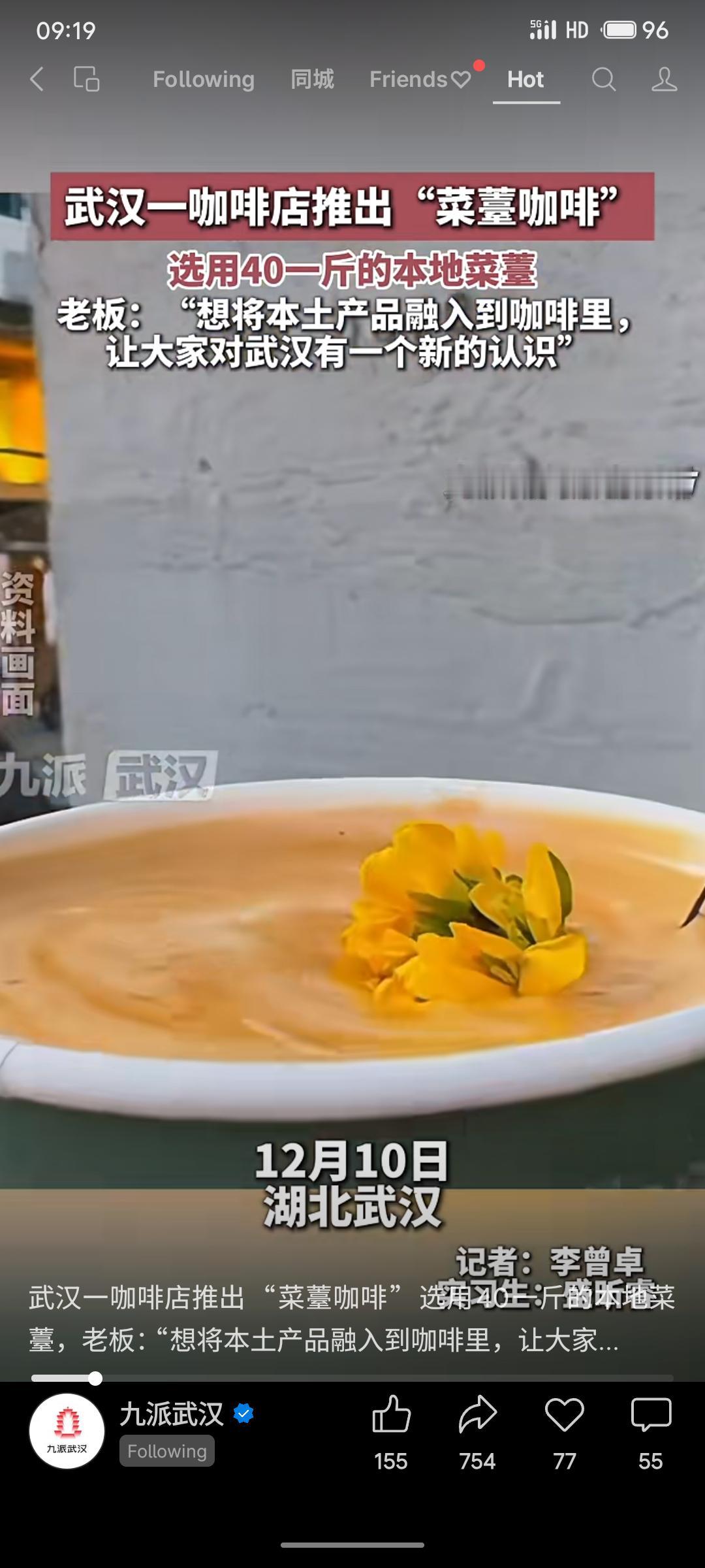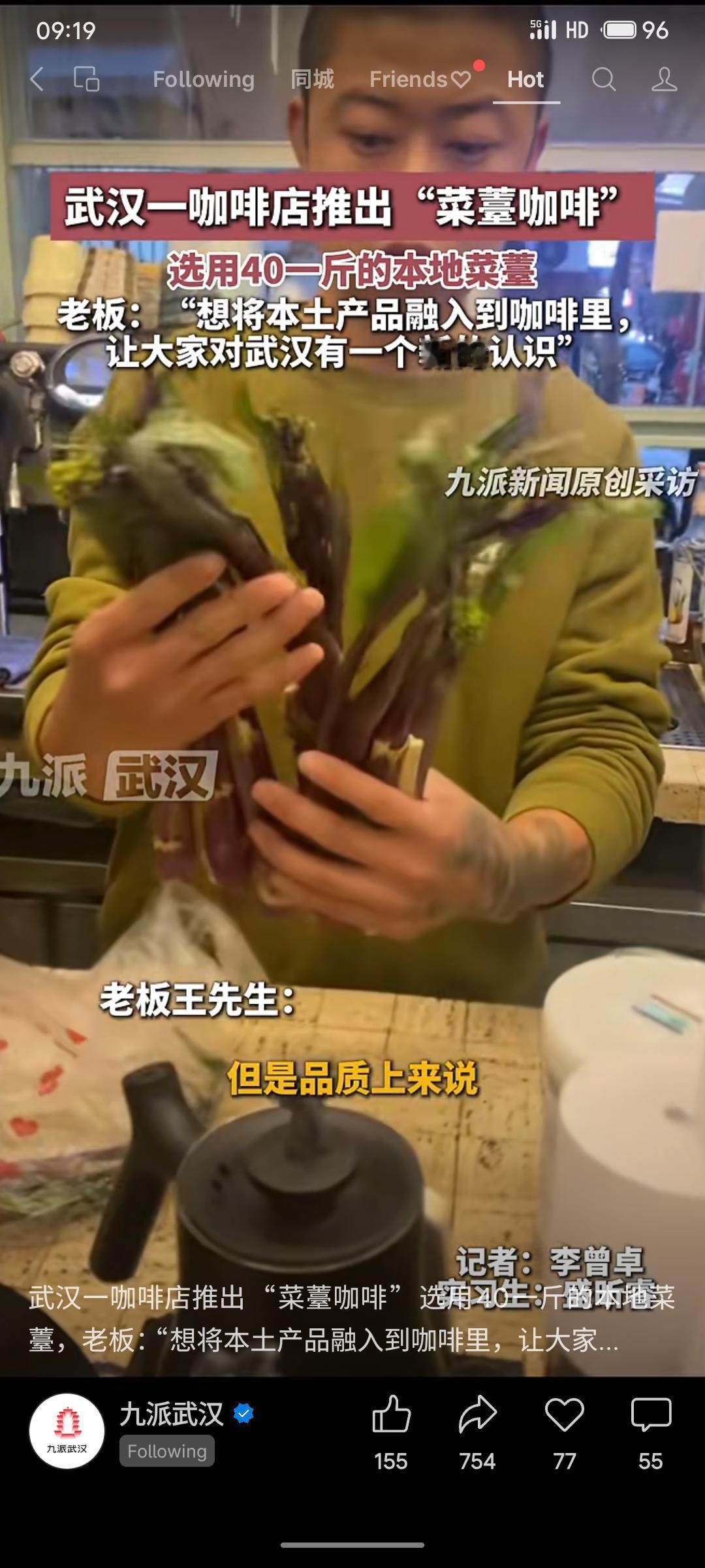 武汉一家咖啡店推出“菜薹咖啡”,选用每斤40元的本地菜薹作为原料。店主表示,此举旨在将本土特色融入咖啡,以创意方式呈现武汉风物,赋予传统食材新的表达。