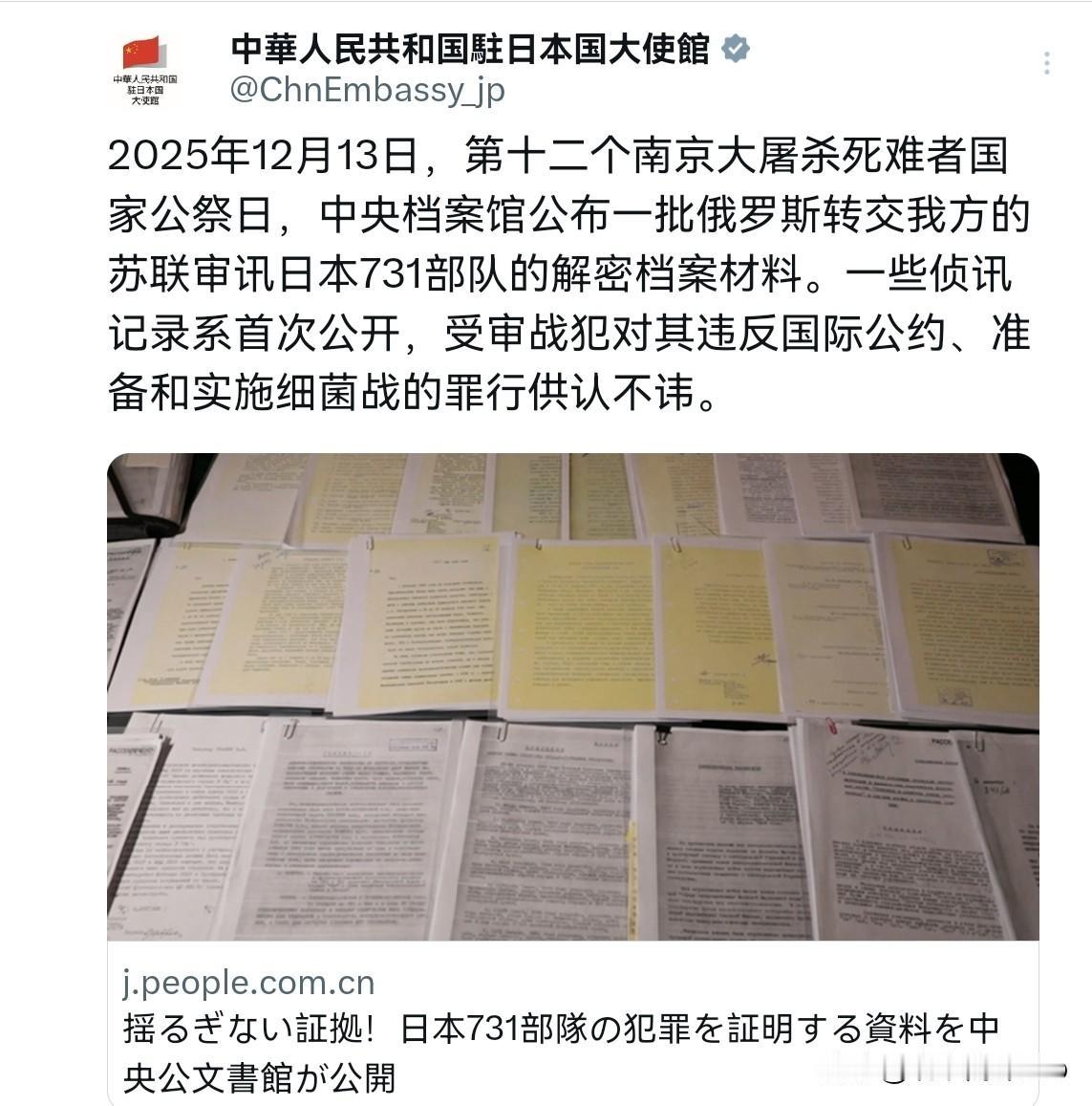 日本妄图抵赖,但我们不会忘记!12月14日,中国住日本大使馆写,2025年12月13日,第十二个南京大屠杀死难者国家公祭日,中央档案馆公布一批俄罗斯转交我方的苏联审讯日本731部队的解密档案材料。一些侦讯记录系首次公开,受审战犯对其违反国际公约、准备和实施细菌战的罪行供认不讳。 很显然,在我们不断拿出日本侵略者惨无人道的侵略罪行证据之际,我们不得不承认,日本国内否认历史,美化侵略的声音不小。这些日本右翼分子否认历史,本质上就是要把当年的日本侵略者轻罪化或者无罪化,而后在现实层面处心积虑的要把日本变成一个所谓的正常国家。 日本对过去的历史要抵赖,但更为重要的是我们不会忘记。在日本右翼分子看来,他们认为我们这是揭日本的伤疤,但是殊不知我们这样的提醒,这是告诫日本千万不要再走这样的邪路。日本侵略的历史给我们带来巨大的伤害,而日本也走向毁灭。 日本切割罪恶历史,或许我们会接纳日本,和平相处。如果日本继续在军国主义道路上狂奔,中日一战的概率非常的大。日本右翼分子从侵略历史中反思的不是为什么要发动战争,而是为什么会战败,他们也不承认自己是被我们击败。但是,中日国力已经彻底逆转,倘若日本铤而走险引爆战争,这一次我们一定要登上日本本土。