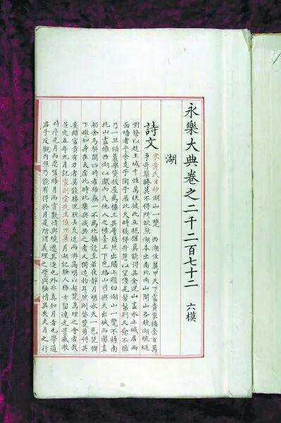 眼前这册《永乐大典》与程有庆在国图地库中看到的《永乐大典》一模一样。袁女士这册《永乐大典》是“模”字韵的“湖”字,内容是与“湖”字有关的部分。此前,国图已经收藏了两册“湖”字单册,在程有庆印象中,中间正好缺这一册。不过为了保险起见,他立刻打电话给曾在中华书局工作的父亲,请他帮忙查一下已发现《永乐大典》的存目。