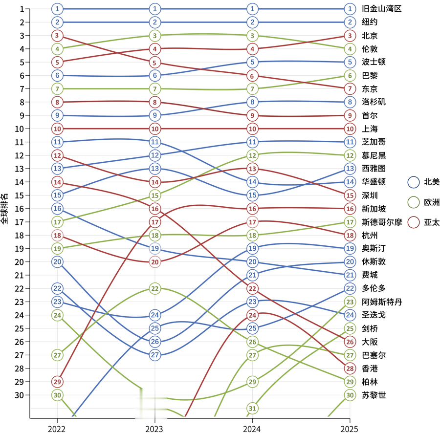 国际科技创新中心发展研讨会今天上午在华东师范大学举行,会上发布《全球科技创新中心100强(2025)》报告。作为连续第四年发布的全球科技创新中心系统性研究成果,该报告对全球142个科技创新中心进行了综合评价,旨在为全球科创治理体系完善和国家科技创新战略布局提供前瞻性参考。综合评估显示,2025年全球科技创新中心前30强依次为:旧金山湾区、纽约、北京、伦敦、波士顿、巴黎、东京、洛杉矶、首尔、上海、芝加哥、慕尼黑、西雅图、华盛顿、深圳、新加坡、斯德哥尔摩、杭州、奥斯汀、休斯敦、费城、多伦多、阿姆斯特丹、圣迭戈、剑桥、大阪、巴塞尔、香港、柏林、苏黎世。在这份榜单中,美国和中国已构成全球科技创新中心最强有力的两极,美国共有27个城市进入百强,中国共有20个城市进入百强,同时在综合能级上实现突破。北京首次跃升至全球前三,仅次于旧金山湾区和纽约,标志着中国头部科创城市正在加速由“国际并跑”迈向“全球领跑”,上海则继续稳居全球科技创新中心第一方队。