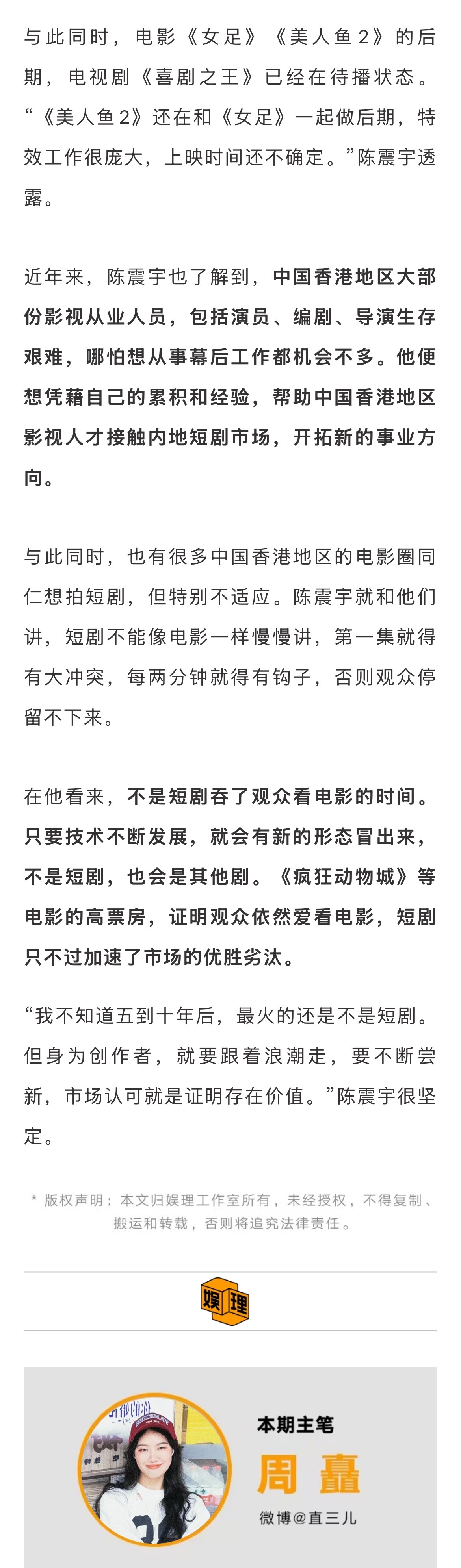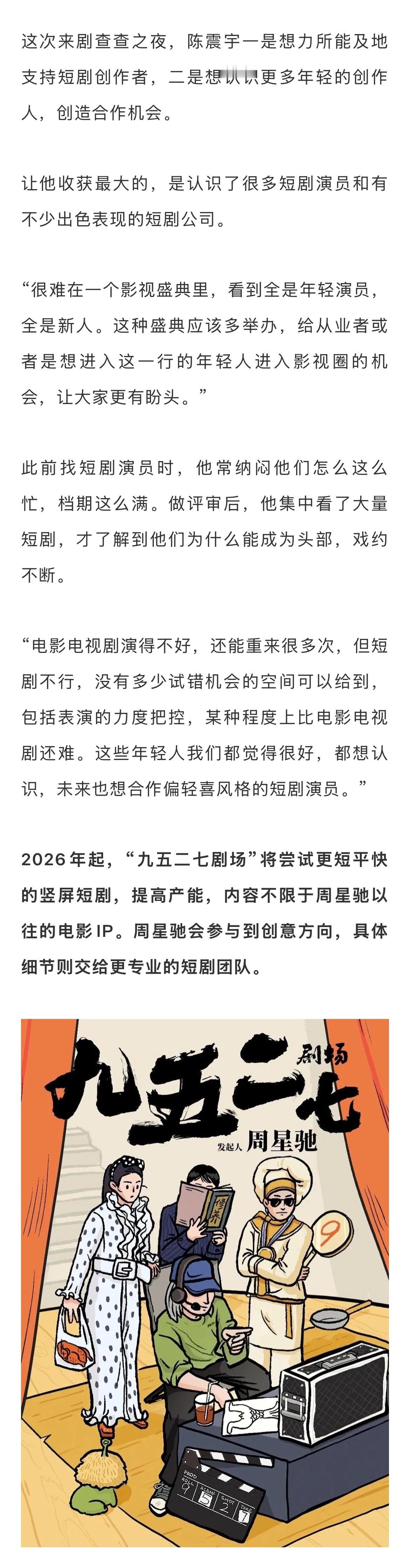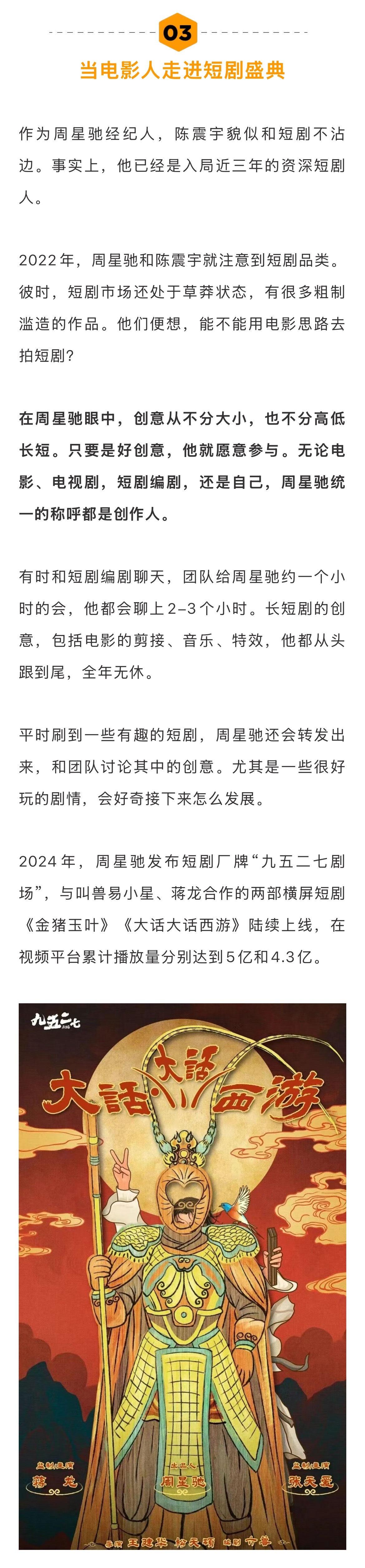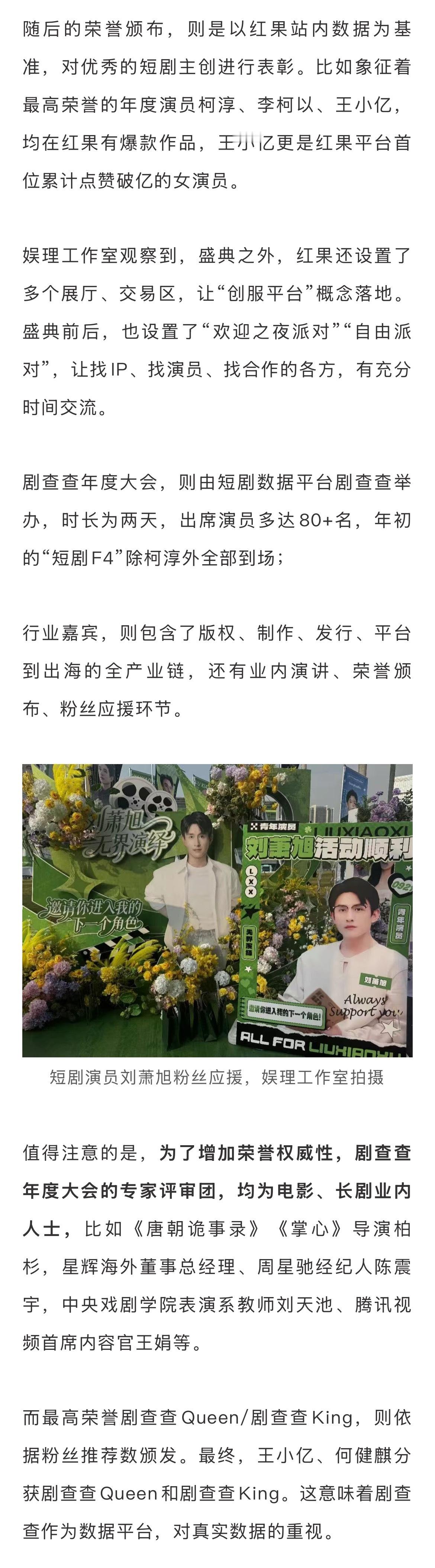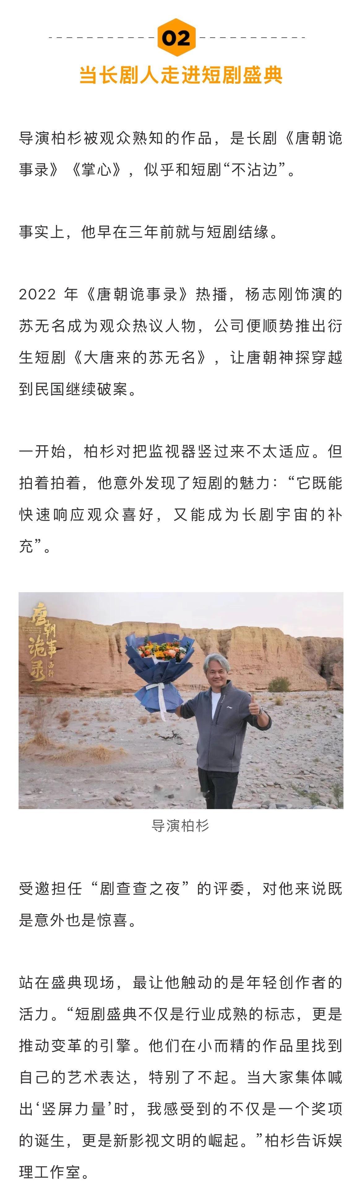 唐诡导演不认同短剧看多了就不看长剧周星驰2022年就注意到了短剧 据新浪娱乐工作室观察,从11月起到12月初,短剧已经在全国各地举办了多档年终盛典,有明星类盛典,也有行业大会。频次、规模都不逊色于长剧、电影。据娱理工作室观察,短剧的年终盛典举办方涵盖了平台、影视城、数据平台等多方,且多与地方政府合办,起到品牌宣传、行业链接、推广拍摄基地等作用。年末,娱理独家亲自参与了几档短剧盛典,并对话了剧查查年度大会专家评审柏杉、陈震宇。据了解,《唐朝诡事录》《掌心》导演导演柏杉早在三年前就与短剧结缘了。面对“短剧看多了就看不进去长剧” 的说法,他表示“随着短剧的发展,从业者和观众都会自然地取长补短,好内容和好节奏才是关键,不用过分纠结体量。”作为周星驰的经纪人,陈震宇已经是入局近三年的资深短剧人。2022年,周星驰和陈震宇就注意到短剧品类。在周星驰眼中,创意从不分大小,也不分高低长短。只要是好创意,他就愿意参与。在他看来,不是短剧吞了观众看电影的时间,短剧只不过加速了市场的优胜劣汰。“我不知道五到十年后,最火的还是不是短剧。但身为创作者,就要跟着浪潮走,要不断尝新,市场认可就是证明存在价值。”谈及当下的短剧盛典热,陈震宇直言“很难在一个影视盛典里,看到全是年轻演员,全是新人。这种盛典应该多举办,给从业者或者是想进入这一行的年轻人进入影视圈的机会,让大家更有盼头。”娱理独家↓