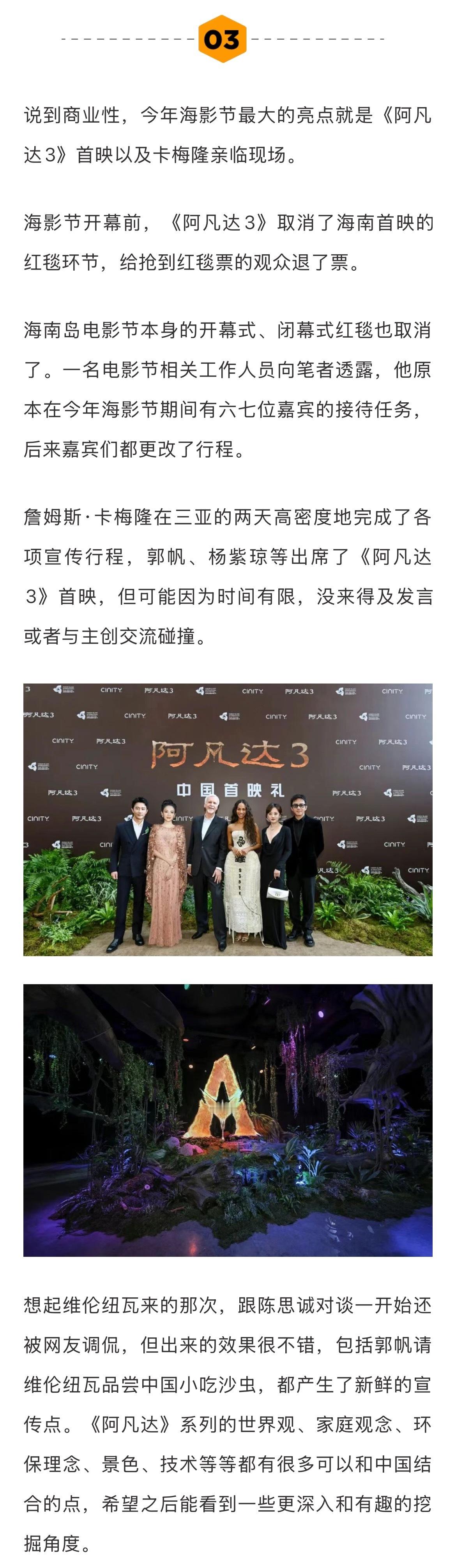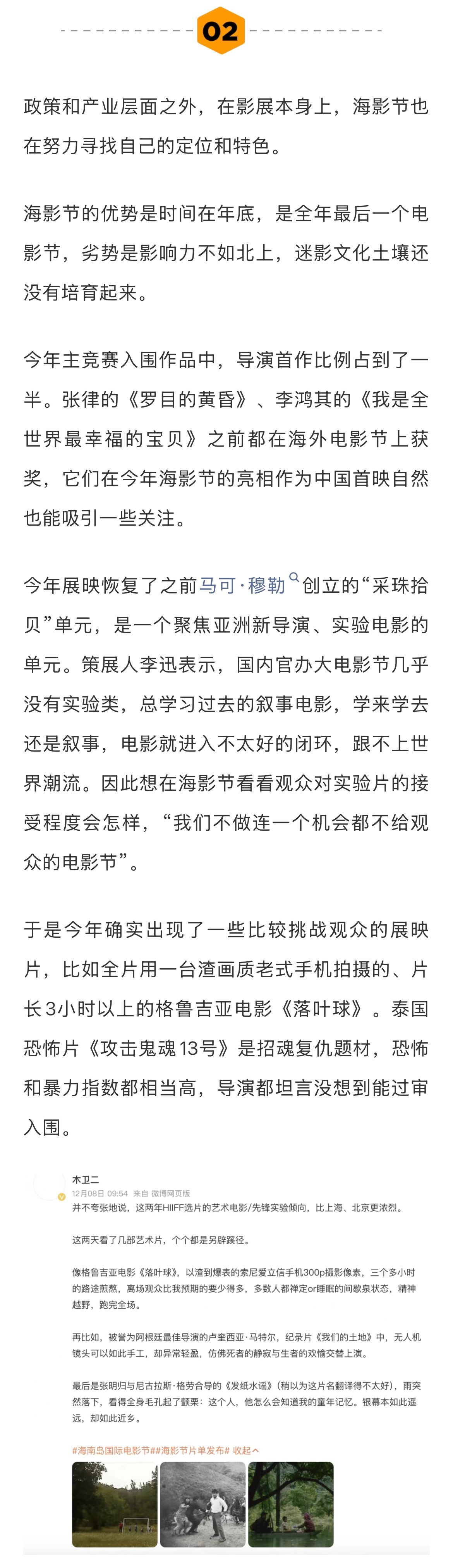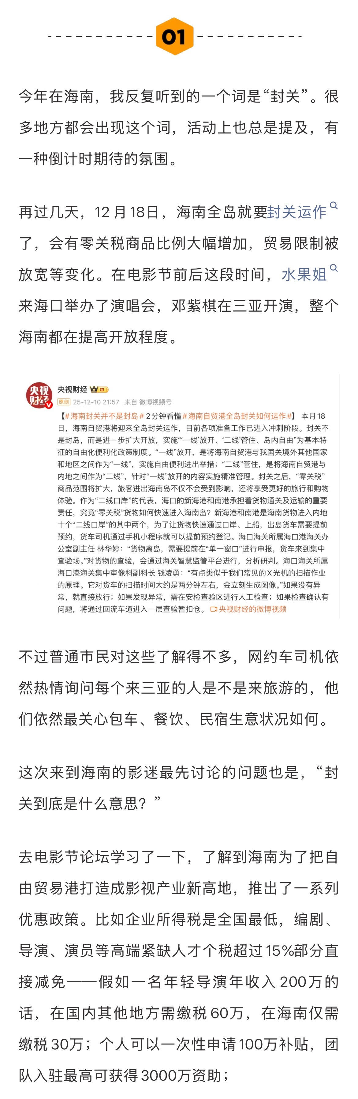 海南岛电影节正在步入正轨今年的海南岛电影节有哪些变化 12月18日,海南全岛就要封关运作了,会有零关税商品比例大幅增加,贸易限制被放宽等变化。零关税对进口影视设备也有用,比如一套1000万的渲染设备,在海南落地即可减免260万税费,这也是为什么《哪吒2》渲染服务公司选择落地海南;海南当地也有一系列扶持政策,只要是关于海南本土文化的剧本、项目,都可以申请扶持资金。过去几年也确实有很多电影在海南拍摄,比如《消失的她》《孤注一掷》《非诚勿扰2》,海南常年温暖湿润,也可以替代东南亚拍摄亚热带、海岛景观。有制片人向新浪娱乐工作室表示,他们的项目在海南拍摄,很顺利地就申请到了税费减免和扶持资金。不过就目前来看,在海南拍摄更多还是为了景色和降低成本,很少有从海南本土特色、文化生发出来的故事,“电影+文旅”的带动作用还不是很明显,也还没能出现一批从海南走出去的创作者。一个电影节对当地电影产业、市场的辐射和影响也还有待观望。政策和产业层面之外,在影展本身上,海影节也在努力寻找自己的定位和特色。比如今年展映恢复了之前马可·穆勒创立的“采珠拾贝”单元,是一个聚焦亚洲新导演、实验电影的单元。在这里,能看到海影节的策展选片、服务团队在用心地带动迷影氛围。不过比起国内其他成熟电影节,海南的地理位置实在不太占优势,从其他地方飞过来都有点远...娱理独家↓