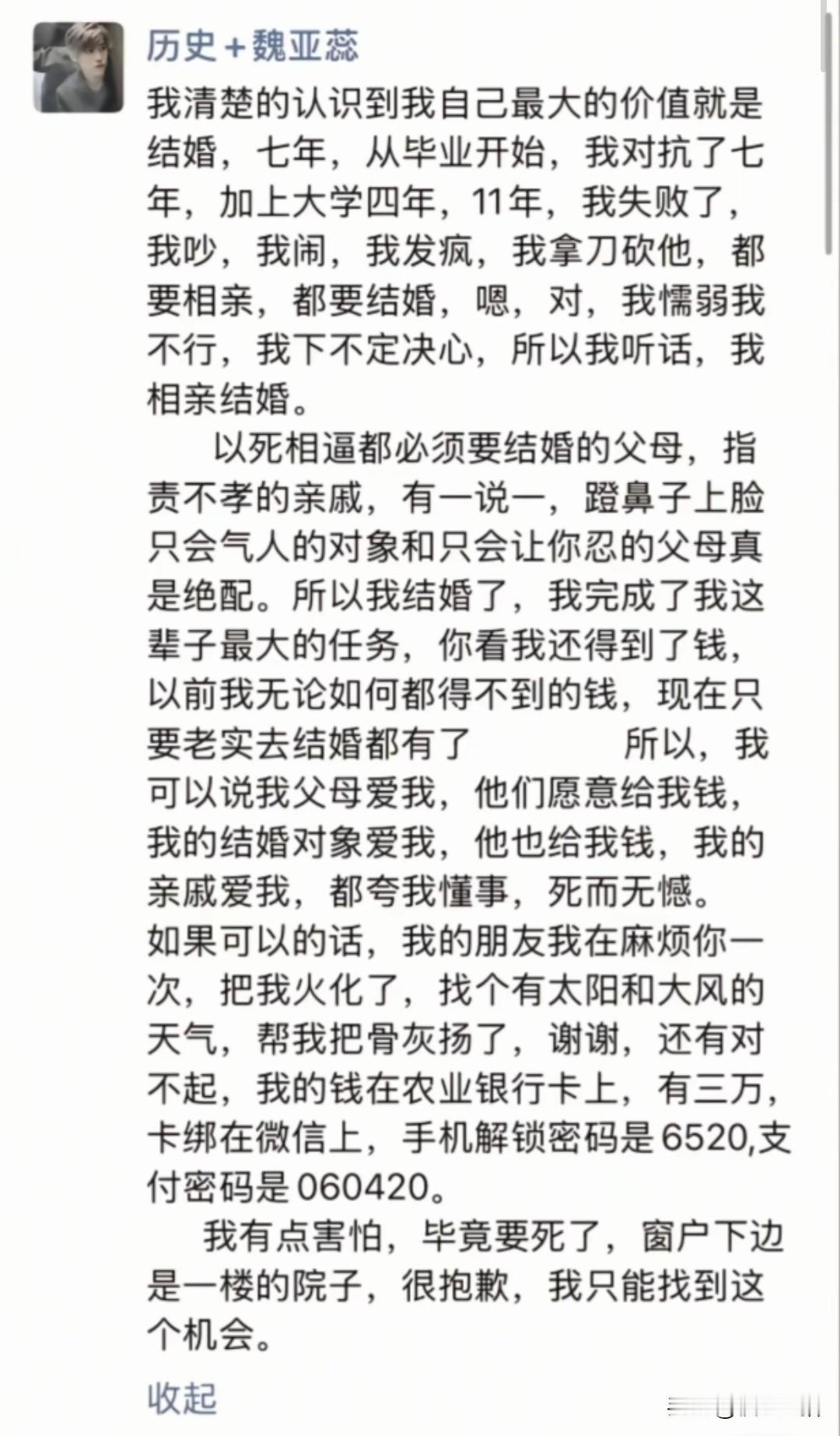 父母的目标达成了,但女儿也没了。 2025年12月10号结婚当天,她从小区的7楼跳下结束了生命,在她死后,父母把她的遗体推给男方,男方又以还没有结婚为由推给女方,10号9点出的事,11号才送去殡仪馆,生活在这样的家庭得多么压抑,如果她知道死后尸体还被互相推诿,得多伤心。 她是一位历史老师(魏老师),今年28岁了,长得很漂亮,还在当地最好的学校教书,一直没有结婚的意愿,父母这个时候就急了,非得给她安排一个婚事,她作为一个高知女性,接受不了命运被安排,她试过拒绝相亲,和他们吵架,甚至以自残威胁,但父母的以死相逼,让她动摇,亲戚们纷纷指责她不孝,最终妥协,这也成为逼死她的导火索,连家都感觉不到温暖,心已经死了。 她遗书中没有一句抱怨,全是对他们的妥协,父母在17岁的时候就因为彩礼逼她结婚,现在她在鲁山县最好的中学教书,有了钱还逼她结婚,才知道原来父母不爱她。 这位老师很善良,因为自己的死给一楼造成很大的影响,在信中表示道歉,但她只有这一次机会,也交代了自己遗体的归属,拜托她朋友,火化后,找个有风,有太阳的地方,把骨灰扬了吧。 她也想做好父母眼中的她,从读书到工作,让父母脸上有光,但还是逃不过他们的安排。 以亲情孝道为名,对她进行绑架,这种世俗观念将魏老师推向深渊,父母要是知道这样的结果,还会逼她吗?