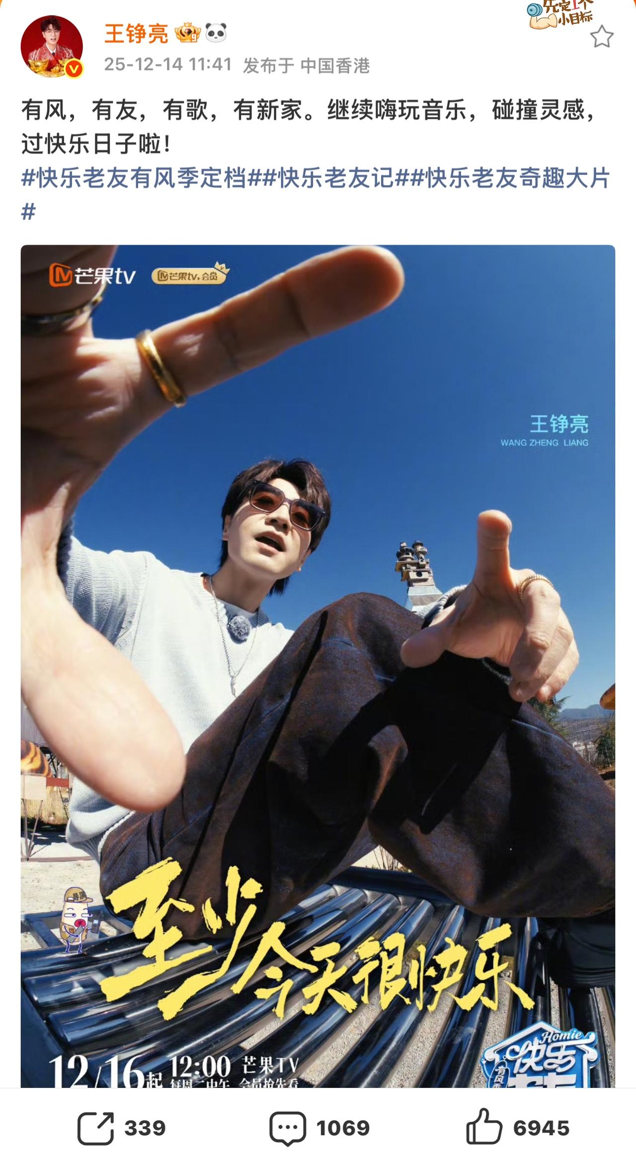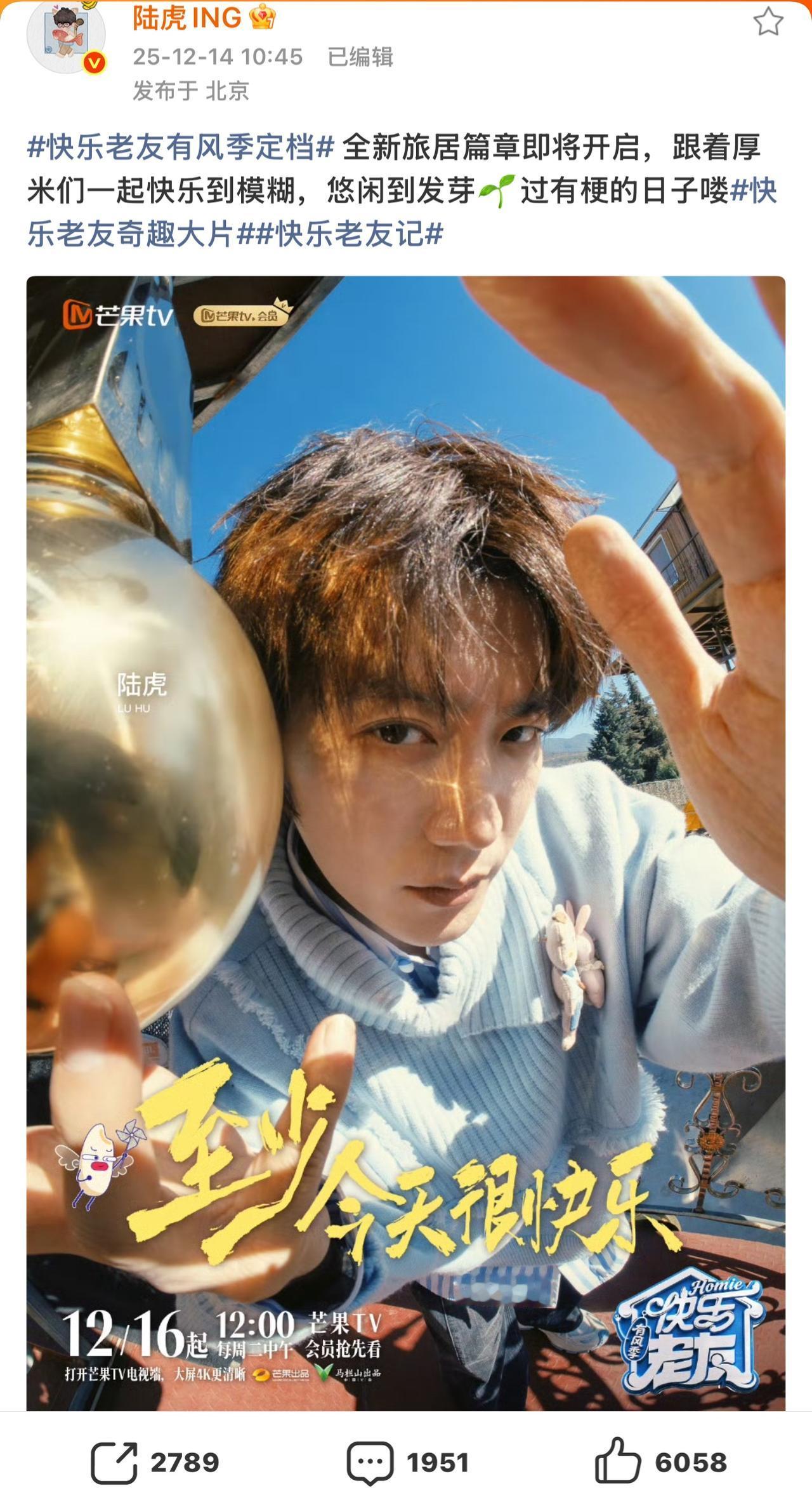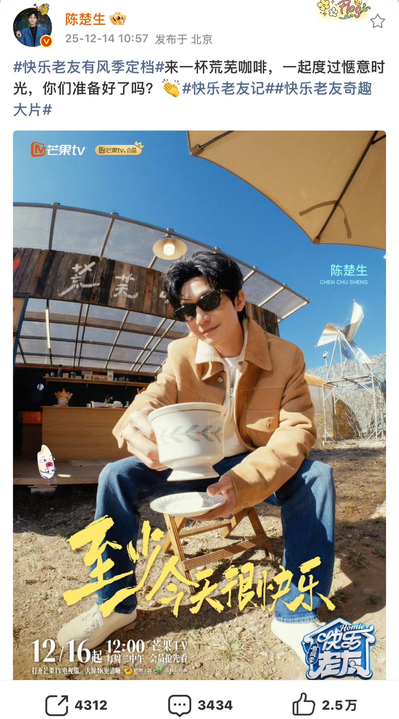 《快乐老友记3》官宣,看看哥几个怎么说的吧。 楚生点题“荒芜咖啡”,邀你度过惬意时光; 苏醒还是很拽,继续一段走心而不重复的文案; 糊糊的“快乐已打包”、“老友已就位”; 张远人气最高,无论转发、评论,还是点赞都高居榜首! 王铮亮继续在有风的地方嗨玩音乐🎵; 虎子已快乐到模糊,悠闲到发芽🌱……。 总之,太让人期待呀。