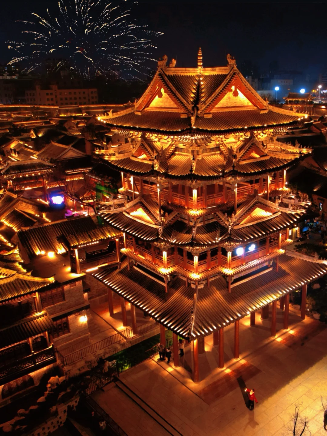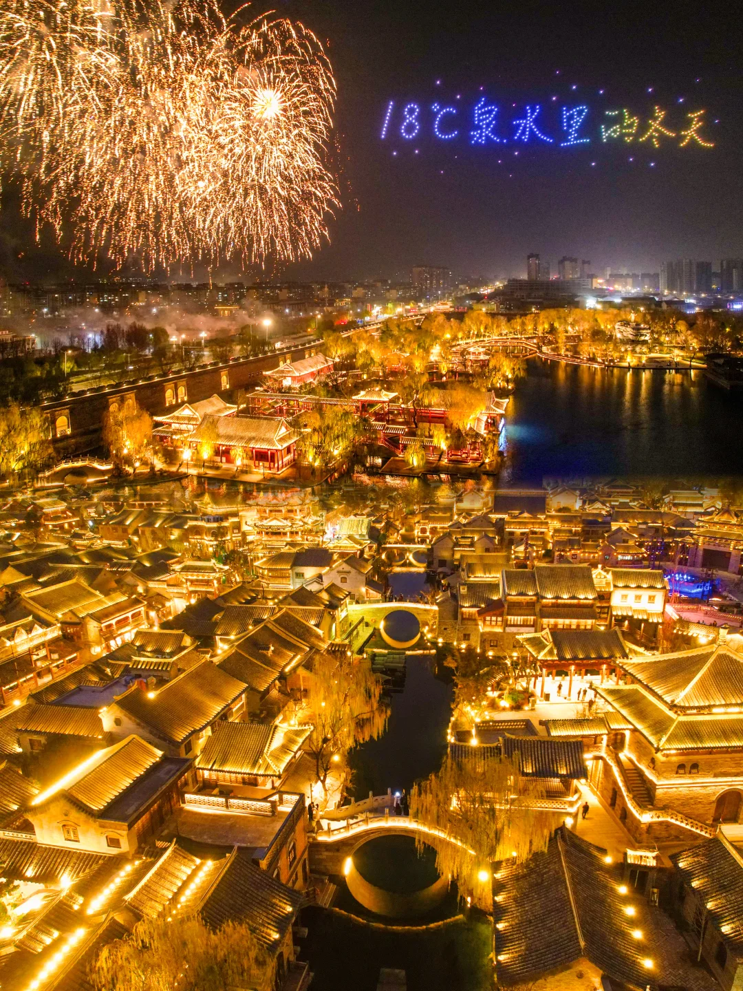 无人机如萤火虫升空,夜空中拼出李清照词句,烟花在古城飞檐炸裂,此刻浪漫值拉满!
