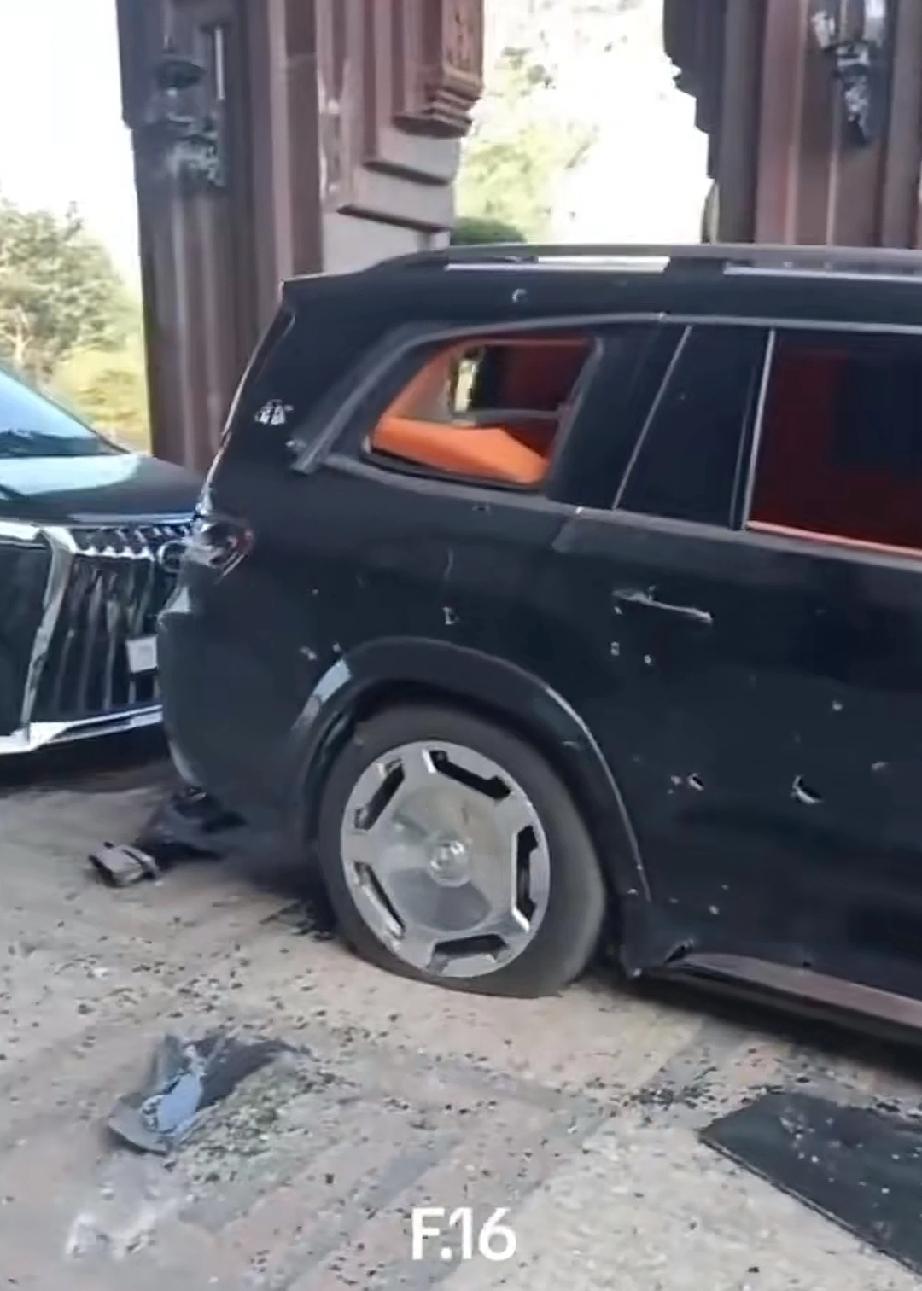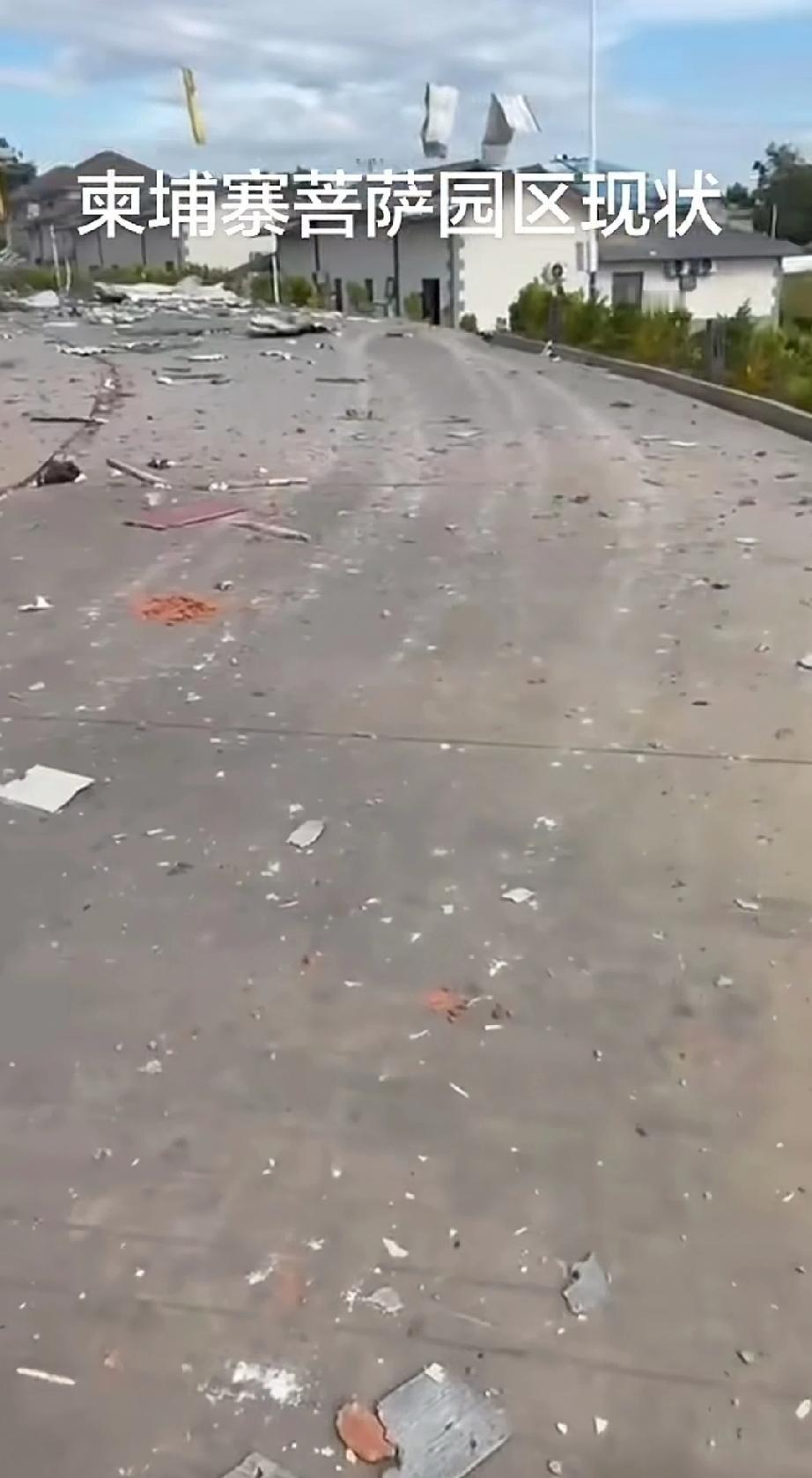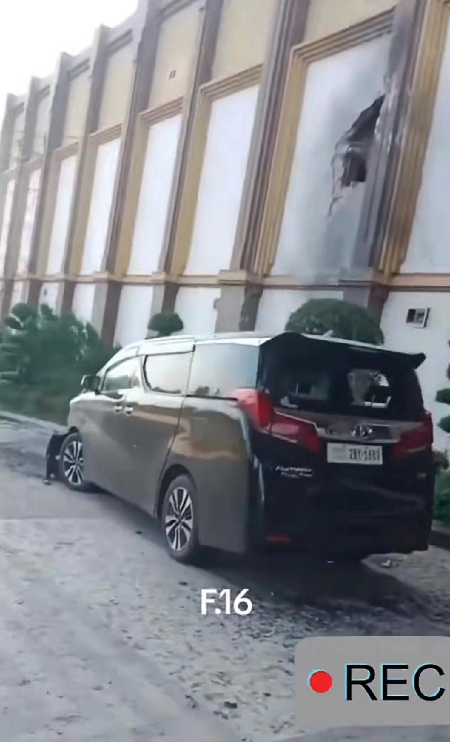 泰国轰炸柬埔寨园区的之后目前的惨状。豪车玻璃震碎,轮胎炸憋了气,建筑被损坏,地上