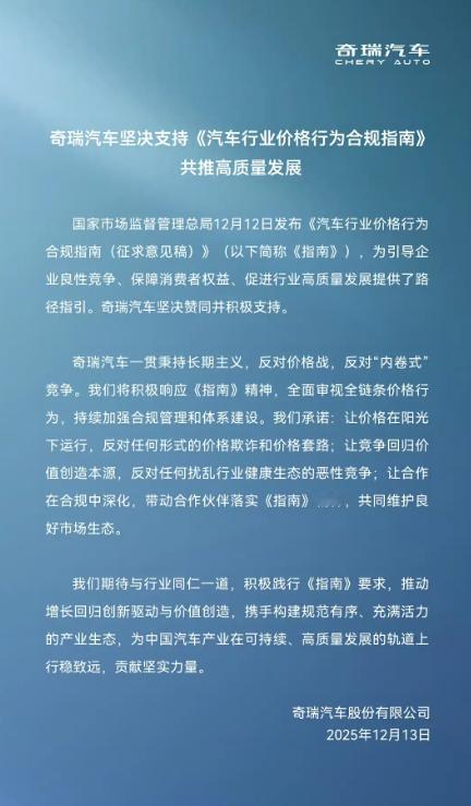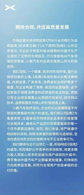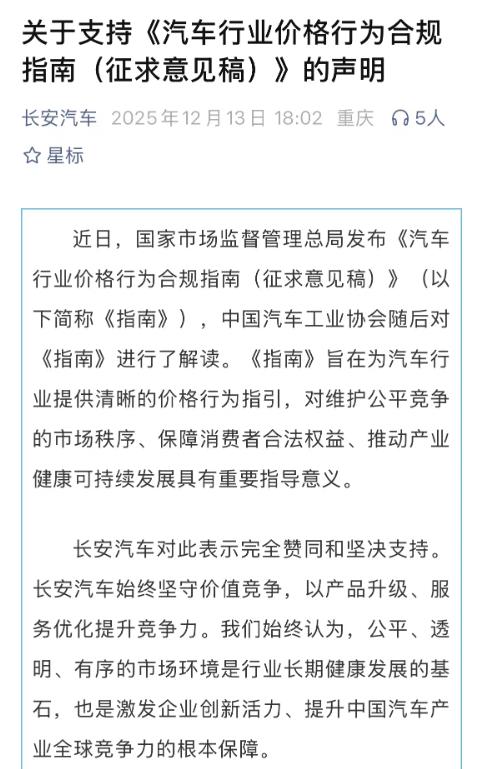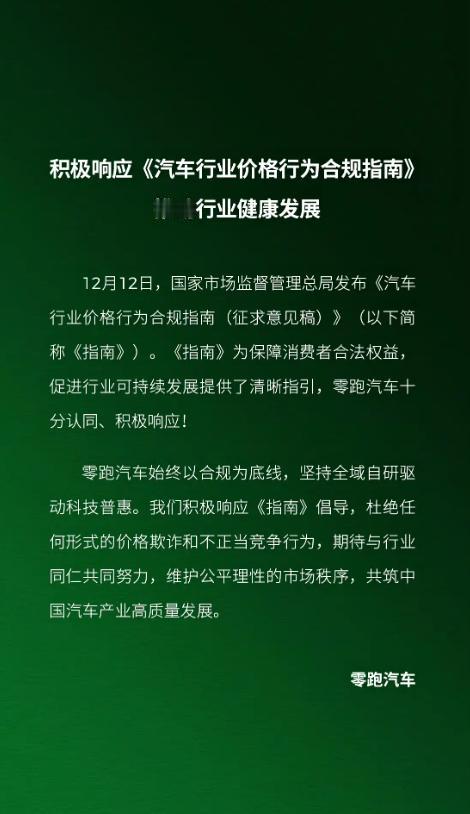 反对价格战! 零跑/小鹏/比亚迪/长安/奇瑞/北汽等多家车企回应支持! 日前,国家市场监督管理总局就《汽车行业价格行为合规指南(征求意见稿)》公开征求意见,为汽车行业提供清晰的价格行为指引,对维护公平竞争的市场秩序、保障消费者合法权益、推动产业健康可持续发展具有重要指导意义。对此,零跑、小鹏、比亚迪、长安、奇瑞、北汽等多家车企回应表示支持。【来自懂车帝车友圈】