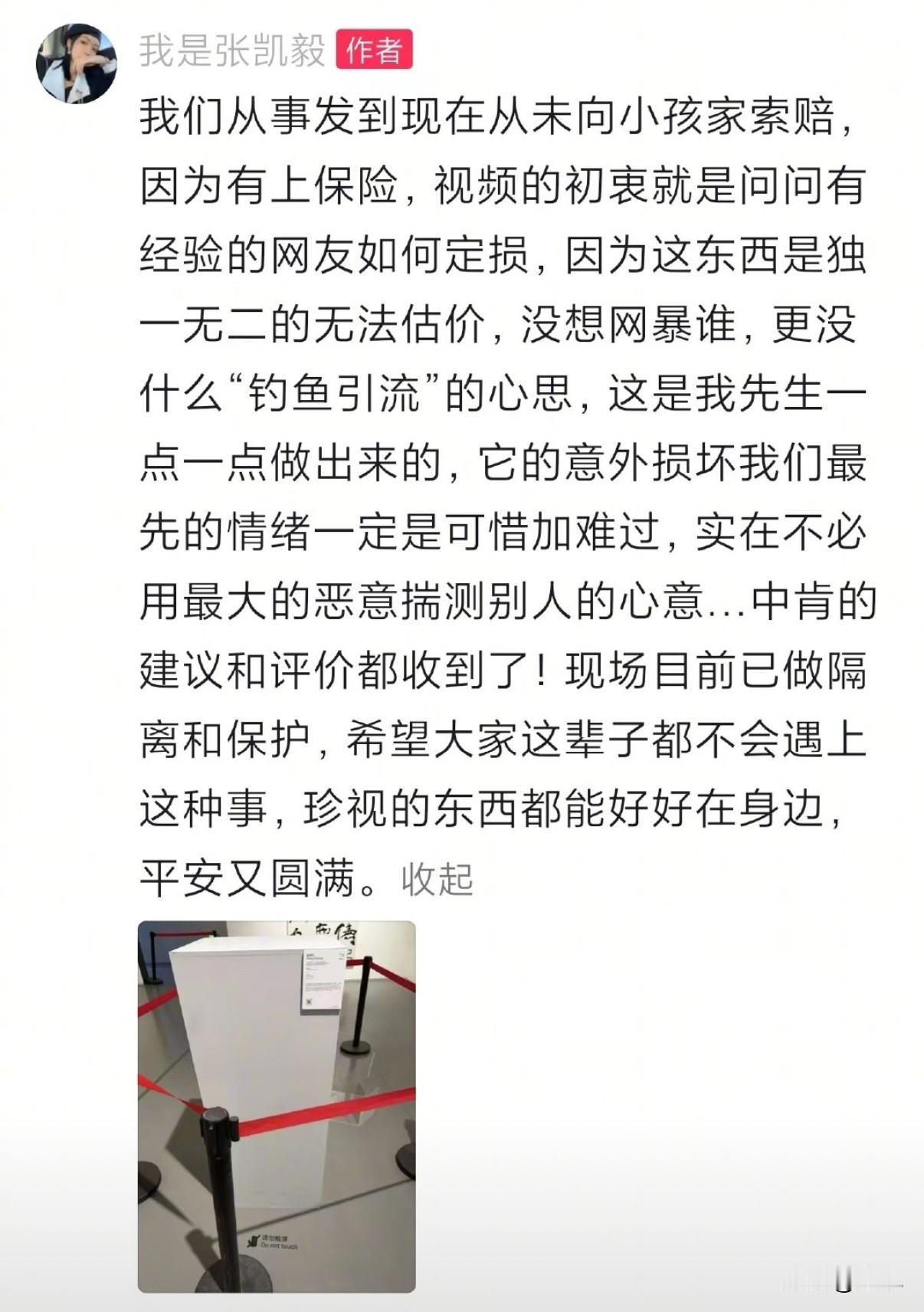 四斤黄金凤冠在展柜里好端端摆着,一家三口过来看展,小朋友伸手一碰,保护罩掉了,连带着凤冠也摔在地上——坏了。 事情就这么发生了。凤冠主人是时尚博主张凯毅,她说这是老公亲手给她做的,意义特别。现在她没找孩子家长赔,因为买了保险,但定损、定责这事儿,挺麻烦。 看视频里,那个保护罩看起来就是罩在展品上,没固定死。小朋友碰一下,罩子就滑落,凤冠跟着倒。有人说,这罩子形同虚设,根本不牢靠。也有人说,看展就不该伸手,这是基本规矩。 这凤冠四斤重,黄金有价,手工和心意难计价。摔一下,修复要钱,就算修好,可能也贬值了。更何况对物主来说,那份纪念意义打了折扣,心里肯定难受。 责任在谁?现场如果保护罩本身就不稳固,轻轻一碰就掉,那展览方有没有责任?如果旁边连个“请勿触摸”的提示都没有,或者有提示但不够明显,是不是也有问题? 反过来,如果罩子本来挺稳,是孩子故意用力推搡,家长就在旁边却没制止,那主要责任就在监护人。孩子小不懂事,大人总该知道展品不能碰。 现在的情况是,两边可能都有点问题。保护措施不够到位,家长也没看住孩子。但具体怎么分,还得看现场证据。 很多网友说,保险理赔之后,保险公司会去找责任方追偿。到时候,展览方和孩子家长,恐怕都免不了一番沟通。 一件精美的工艺品,一场意料之外的损坏,谁看了都觉得可惜。展览是为了让大家欣赏,保护措施是不是该更用心一点?带孩子看展,家长是不是得多留神一点? 这事说到底,就是个提醒。看展的规矩要守,办展的保护也得做实。不然,好东西坏了,谁都不痛快。
