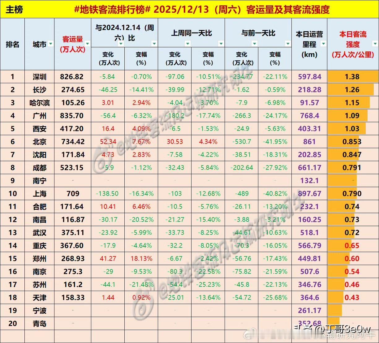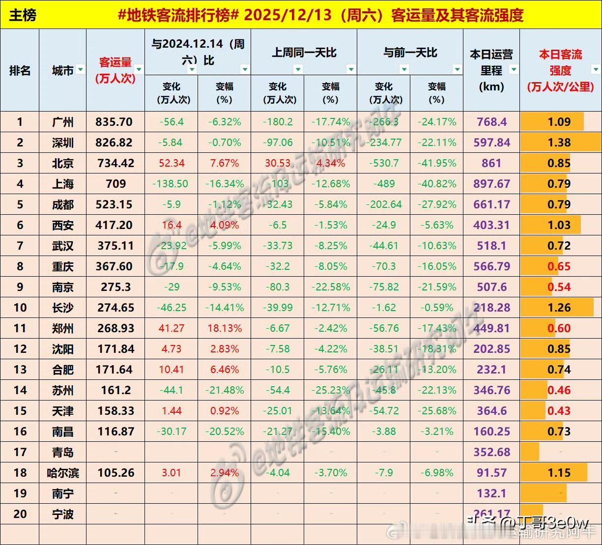 苏州周六地铁客流量161万人次,低于合肥[呲牙][呲牙][呲牙] 爆料 身边事 排行榜 周六 苏州地铁 地铁客流排行榜 中国地铁客流日报 昨日客流 2025年12月13日 星期6️⃣ 全国重点城市轨道交通客流量排行榜: 广州:835.70万 深圳:826.82万 北京:734.42万北京身边事 上海:709.00万 成都:523.15万 西安:417.20万西安地铁 武汉:375.11万 重庆:367.60万重庆身边事 南京:275.30万南京爆料 长沙:274.62万 郑州:268.93万郑州地铁 沈阳:171.84万 合肥:171.64万合肥身边事 苏州:161.20万苏州爆料 天津:158.33万天津地铁 南昌:116.87万 青岛:100万+青岛爆料 哈尔滨105.26万哈尔滨身边事 南宁:100万+南宁地铁 宁波:100万+