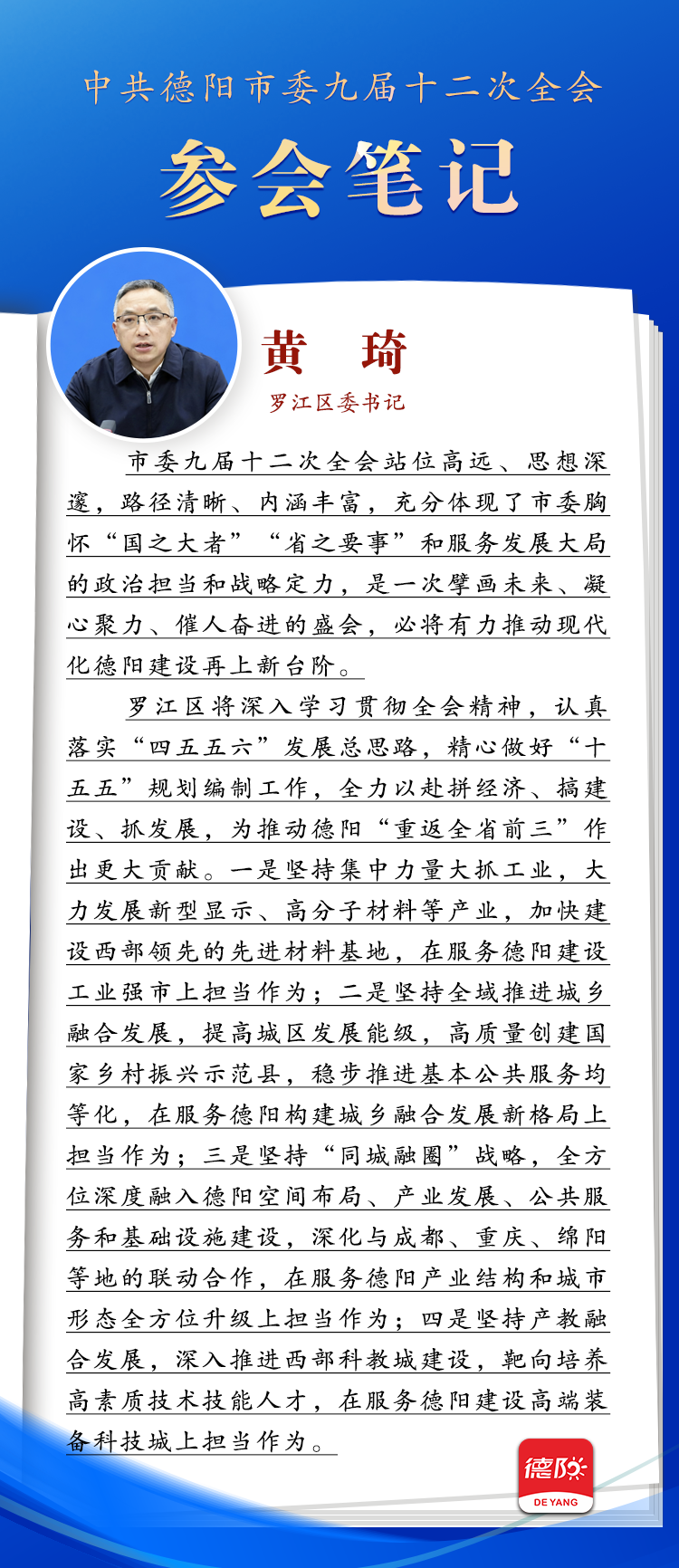 罗江区将深入学习贯彻全会精神,认真落实“四五五六”发展总思路,精心做好“十五五”规划编制工作,全力以赴拼经济、搞建设、抓发展,为推动德阳“重返全省前三”作出更大贡献。一是坚持集中力量大抓工业,大力发展新型显示、高分子材料等产业,加快建设西部领先的先进材料基地,在服务德阳建设工业强市上担当作为;二是坚持全域推进城乡融合发展,提高城区发展能级,高质量创建国家乡村振兴示范县,稳步推进基本公共服务均等化,在服务德阳构建城乡融合发展新格局上担当作为;三是坚持“同城融圈”战略,全方位深度融入德阳空间布局、产业发展、公共服务和基础设施建设,深化与成都、重庆、绵阳等地的联动合作,在服务德阳产业结构和城市形态全方位升级上担当作为;四是坚持产教融合发展,深入推进西部科教城建设,靶向培养高素质技术技能人才,在服务德阳建设高端装备科技城上担当作为。