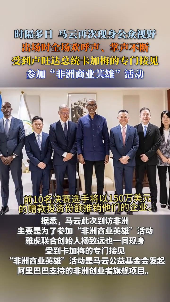 时隔多日马云再次现身公众视野,出场时全场欢呼声、掌声不断。 据报道,时隔多日马云再次现身公众视野,出现在了非洲。马云13日突然现身卢旺达首都基加利与卢旺达总统卡加梅会谈。马云出场时,全场欢呼声、鼓掌声不断。 今天下午在基加利,卢旺达总统Kagame总裁会见了阿里巴巴集团创始人马云和雅虎联合创始人Jerry Yang。据悉,马云此次到访非洲主要是为了参加"非洲商业英雄"活动。雅虎联合创始人杨致远也一同现身,受到卡加梅的专门接见。 "非洲商业英雄"活动是马云公益基金会发起阿里巴巴支持的非洲创业者旗舰项目。讨论了创业和创新方面的伙伴关系。ck Ma和Jerry Yang在基加利为非洲商业英雄(ABH)工作,前10名决赛选手将以150万美元的赠款投资份额推销他们的企业。