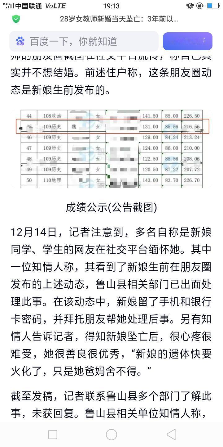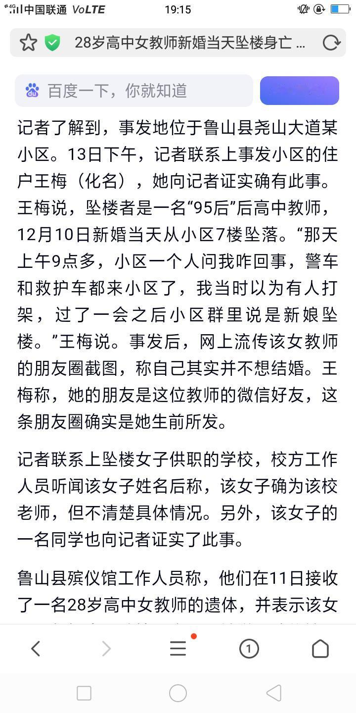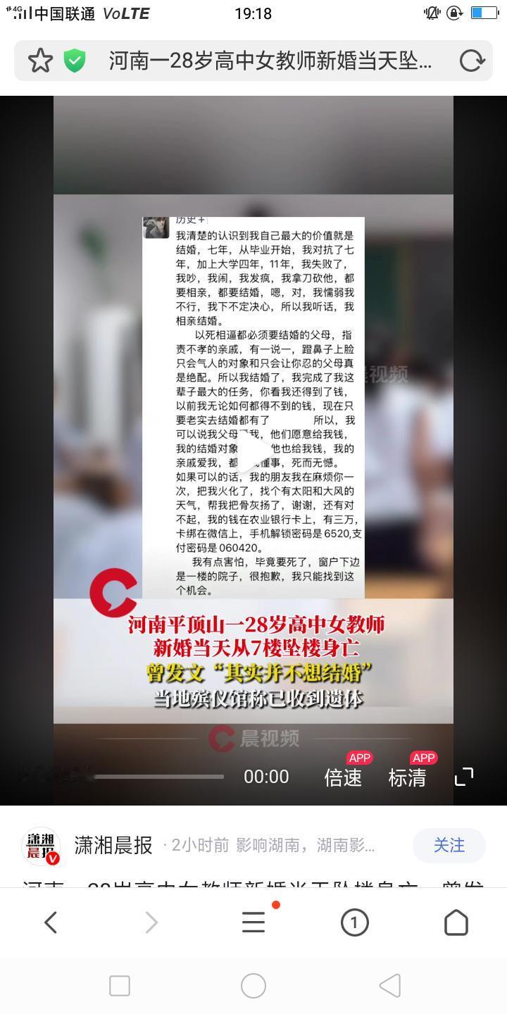 河南28岁的新娘魏老师让我们心疼! 她生前发了一个朋友圈说:自己反抗了整整11年,这期间她说自己拿刀砍他,我吵,我闹,我发疯!!!还是失败了,父母催婚,让她相亲,她妥协了! 最终选择在结婚的第一天,早上9点多她选择从7楼跳了下来! 她肯定是绝望了,才会选择这种极端的方式,不知道她的父母现在是什么感受呢?有没有后悔呢? 遇到这样的父母,魏老师也是委屈了,这就是所谓的我打着为你好的旗号,完全没有为孩子考虑过!跟这样的父母生活她肯定是很压抑的,结婚肯定是导火线,平时日常生活肯定都是对她控制的,起码精神上的和生活上的控制少不了! 我希望大家都能善待自己的孩子,善待自己的家人~