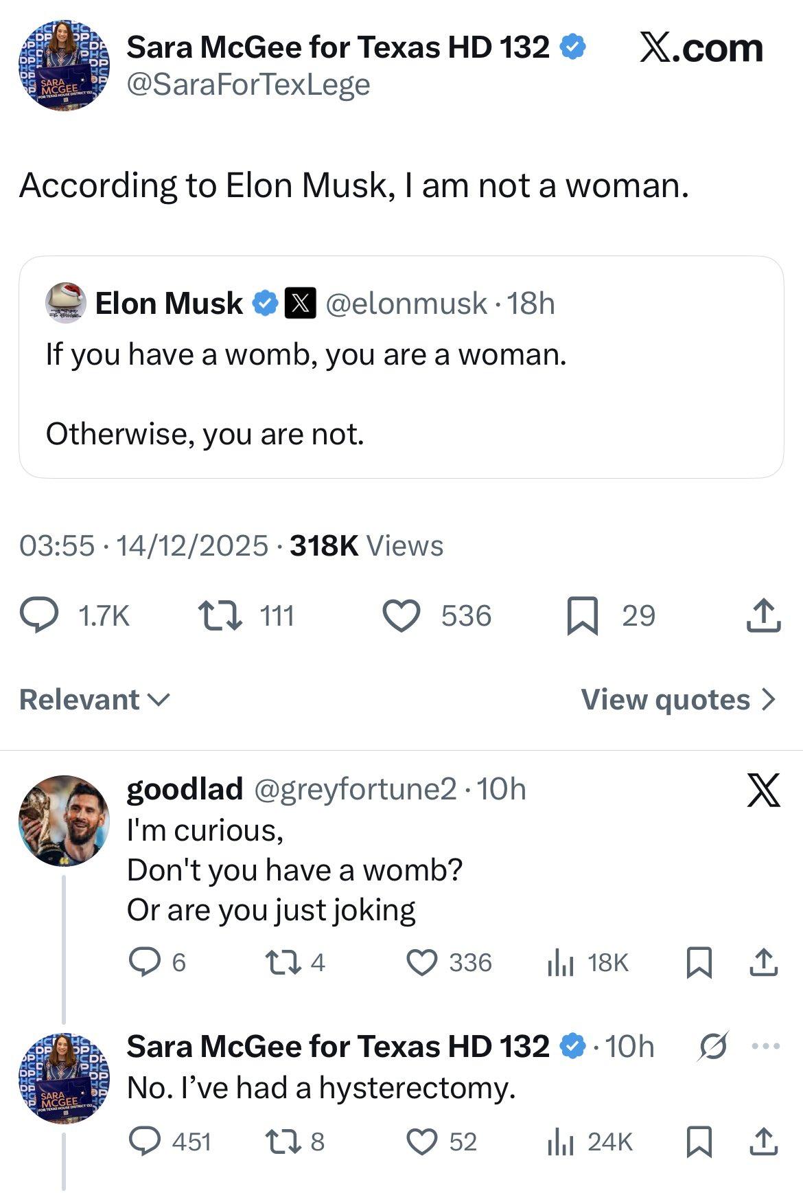 马斯克在社交平台发文说:“如果你有子宫,你就是女人;如果没有子宫,你就不是女人。” 这句话,对正常人来说是基本的常识。 结果,一位民主党自由派女性转发并嘲讽说:“根据马斯克所说,我不是女的。” 下面回复有人问她:“出于好奇,你没有子宫吗?” 她回答:“我做了子宫切除术。” 南评:没有子宫怎么做子宫切除手术?欧美的自由派女性已经失去了对人类基本常识的认知,而她们对什么跨性别,不男不女,却异常推崇和追捧。例如自称为女性的男性上女厕所,在她们的认知中是完全合理的。