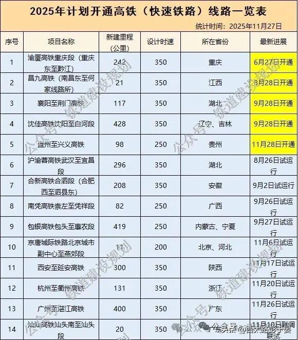 2025年底的中国高铁版图,正上演一场无声却关键的“抢位赛”!9条新线密集通车,绝非简单的线路叠加,而是高铁网从“主干连通”迈向“网络加密”的质变时刻。 一、西延高铁,长299公里,时速350公里。 二、包银高铁包头至惠农段,长420公里,时速250公里。 三、合新高铁合肥至泗县段,长207公里,时速350公里。 四、京唐城际,长36公里,时速250公里。 五、广湛高铁,401公里的长度、350公里的时速。 六、沪渝蓉高铁武汉至宜昌段,长313公里、时速350公里。 七、汕汕高铁汕头南至汕头段,长19.8公里,时速250公里。 八、杭衢高铁,长200公里,时速350公里。 九、南凭高铁崇左至凭祥段,设计时速250公里,长81公里 具体情况如下: 陕北终于迎来高铁时代——299公里的西延高铁以350公里时速飞驰,西安到延安缩至1小时,黄帝陵、宝塔山等红色景点被“串珠成链”,还能推动“研发在关中、转化在陕北”的产业协同。 西北的包银高铁包头至惠农段,420公里线路让包头到银川从6小时缩短至2小时,呼包鄂与宁夏沿黄经济区联动更紧密。 长江经济带再添动力:沪渝蓉高铁武汉至宜昌段313公里线路时速350公里,武汉到宜昌仅需1小时,钟祥、京山等城市首次迈入高铁时代,助力长江经济带要素流动。 华南的广湛高铁401公里线路贯通后,珠三角与粤西的时空距离大幅压缩,产业转移更顺畅。 这些新线各有使命:杭衢高铁加密长三角路网,南凭高铁打通中越边境通道,京唐城际让京津通勤更高效。它们看似独立,实则协同——一条线贯通就能让既有路网价值重估,人流、物流、资金流随之重构。 高铁一响,黄金万两。这场轨道上的时空竞争,正悄悄催生出新的区域增长极。你家门口的高铁要通了吗?