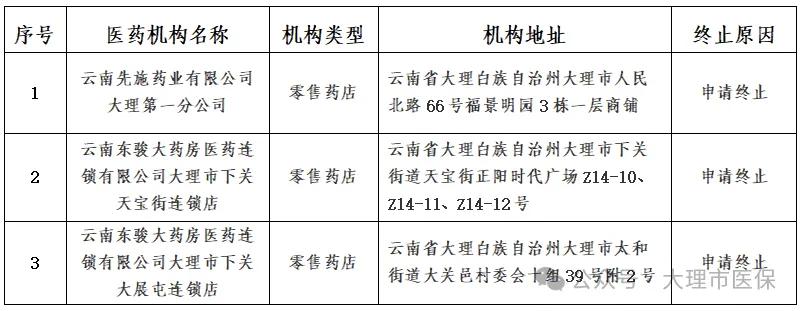 2025年12月10日大理市医保中心发布:大理3家零售药店被终止医保服务 2025年大理市终止3家零售药店医保服务协议公告(第四期) 为强化定点零售药店协议管理,守护医保基金安全,依据《零售药店医疗保障定点管理暂行办法》《大理市定点零售药店医疗保障服务协议》相关规定,对云南先施药业有限公司大理第一分公司、云南东骏大药房医药连锁有限公司大理市下关天宝街连锁店、云南东骏大药房医药连锁有限公司大理市下关大展屯连锁店3家零售药店,作出终止定点医保服务协议的处理,现予以公告。 机构名单如下: 医保服务协议终止后,这3家零售药店将不再作为我市基本医保定点机构。请广大参保人合理选点就医购药。