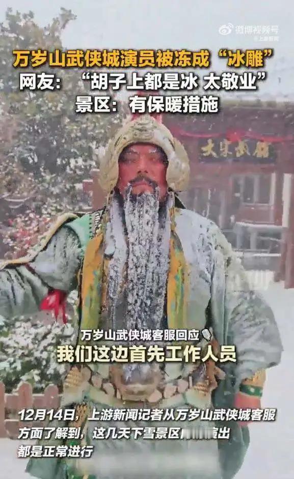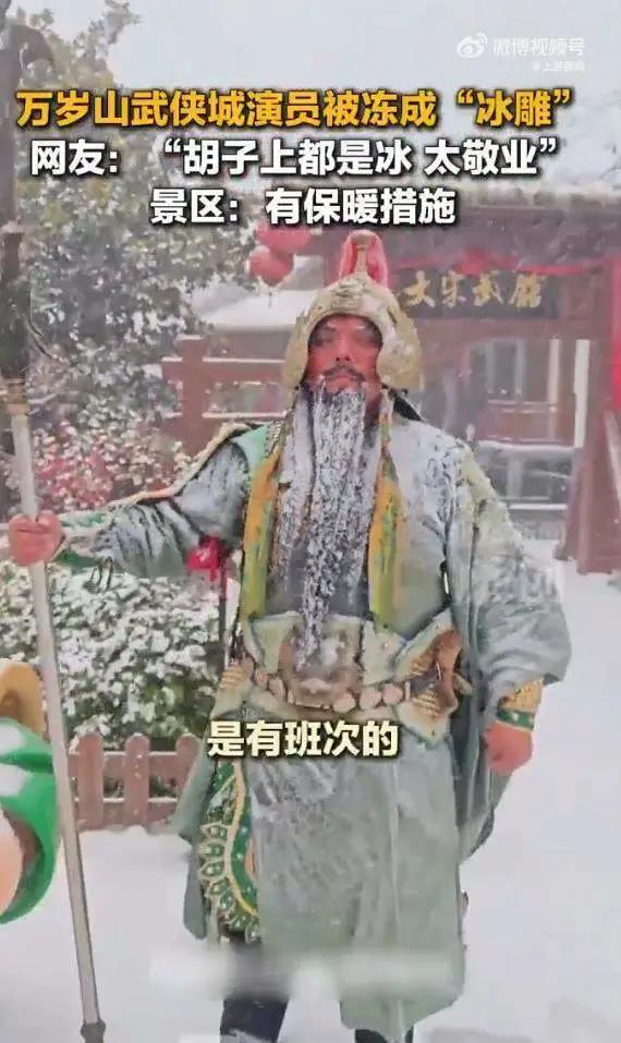 最近河南多地下雪,开封万岁山武侠城的一位NPC演员可太拼了。有游客看到雪地里像“冰雕”一样的关羽,走近才发现是正在表演站岗的演员,他身上都是雪,胡子上也挂着冰,这敬业精神太让人佩服了。 12 月这几天下雪,景区演出正常进行。虽然有网友心疼演员辛苦,不过景区客服说工作人员有轮班,还提供了暖宝宝、热水,也在陆续换厚衣服。之前清明上河图景区也有演员在关键剧情时跃入冷水,景区同样有保暖保障。大雪天里,像《雪夜山神庙》这类演出氛围拉满,演员全情投入,就为了让游客不虚此行。