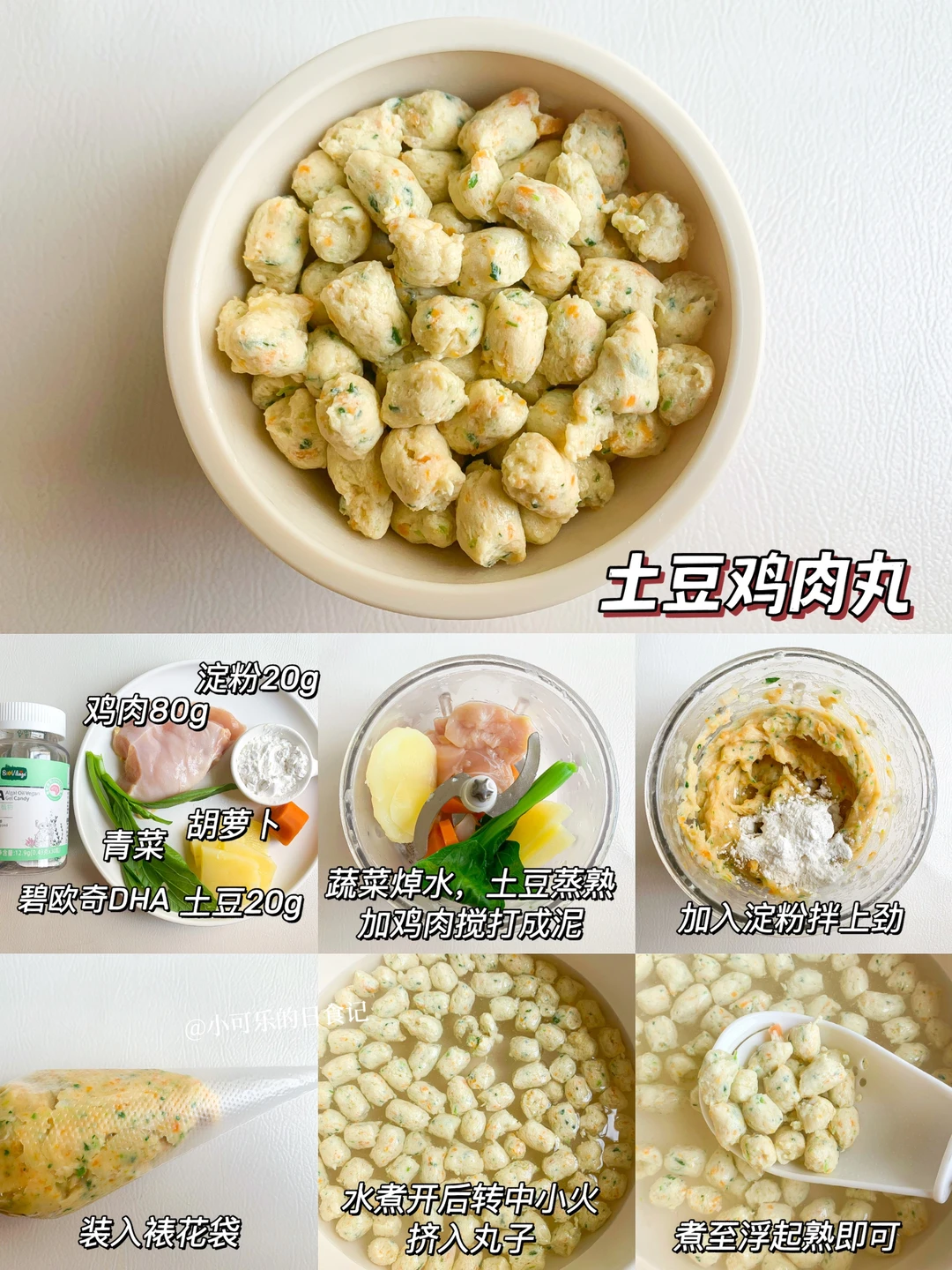 1⃣️土豆蒸熟、蔬菜焯水加鸡肉搅打细腻2⃣️加淀粉顺时针搅拌上劲,装入裱花袋3⃣️水煮开转中小火,挤入丸子,煮至浮起熟即可。