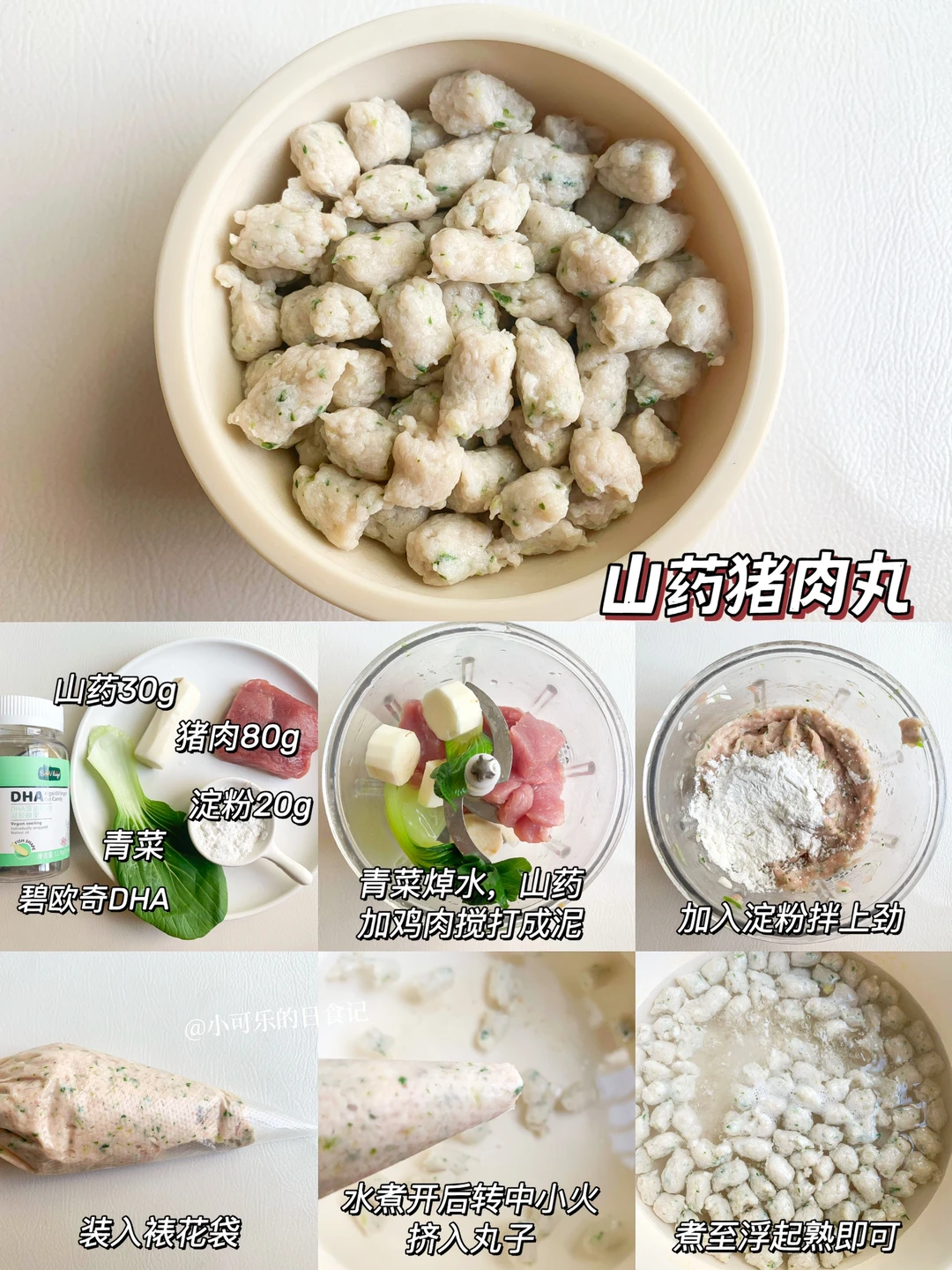 🛒食材:铁棍山药30g、猪肉80g、青菜、玉米淀粉20g