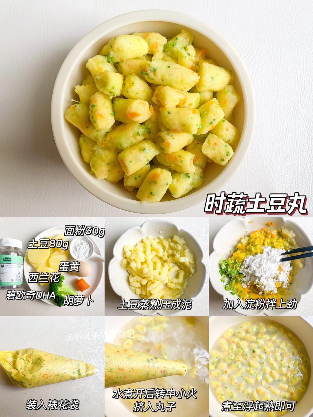 1⃣️土豆蒸熟压成泥,加焯水的胡萝卜西兰花,蛋黄和面粉,顺时针搅拌上劲,装入裱花袋2⃣️水煮开转中小火,挤入丸子,煮至浮起熟即可。