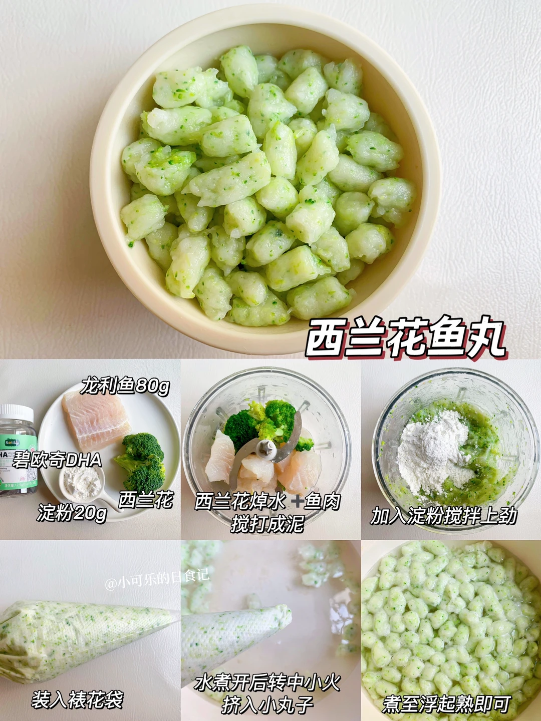 1⃣️焯水的西兰花加鱼肉搅打细腻2⃣️加淀粉顺时针搅拌上劲,装入裱花袋3⃣️水煮开转中小火,挤入丸子,煮至浮起熟即可。