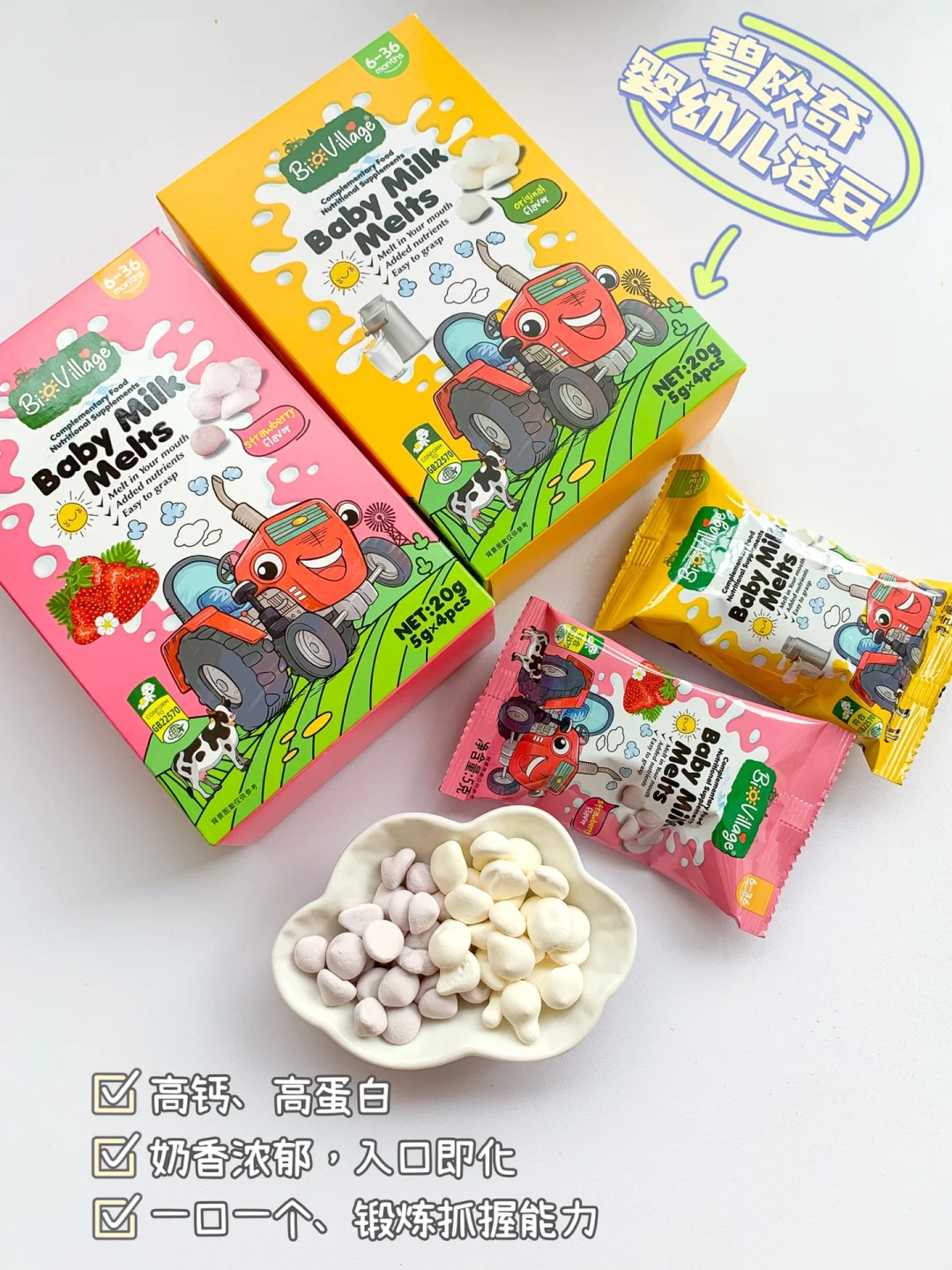 ❤妈妈们如果自己没时间做,也可以选择成品溶豆,比如碧欧奇婴幼儿溶豆,它是专门为小宝宝设计的,符合婴幼儿标准,合适小月龄宝宝的溶豆,水滴形状,方便宝宝抓握。添加了营养素,36个月以内的宝宝每天能吃的食物有限,从而导致了能够摄入的营养元素有限,需要额外补充,奶香十足,入口即化,钙含量高比奶酪还高,宝宝很喜欢吃。