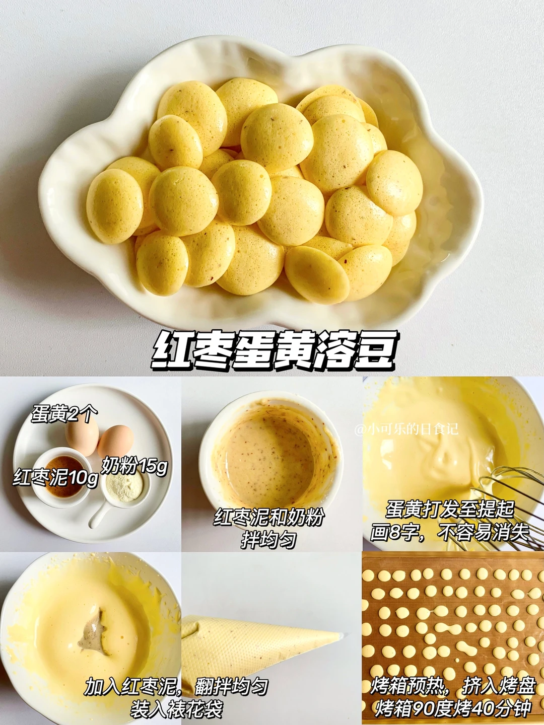 1⃣️入口即化的溶豆切记要把蛋黄打发至划八字不容易消失,加入果酱的时候要用翻版的手法,拌均匀