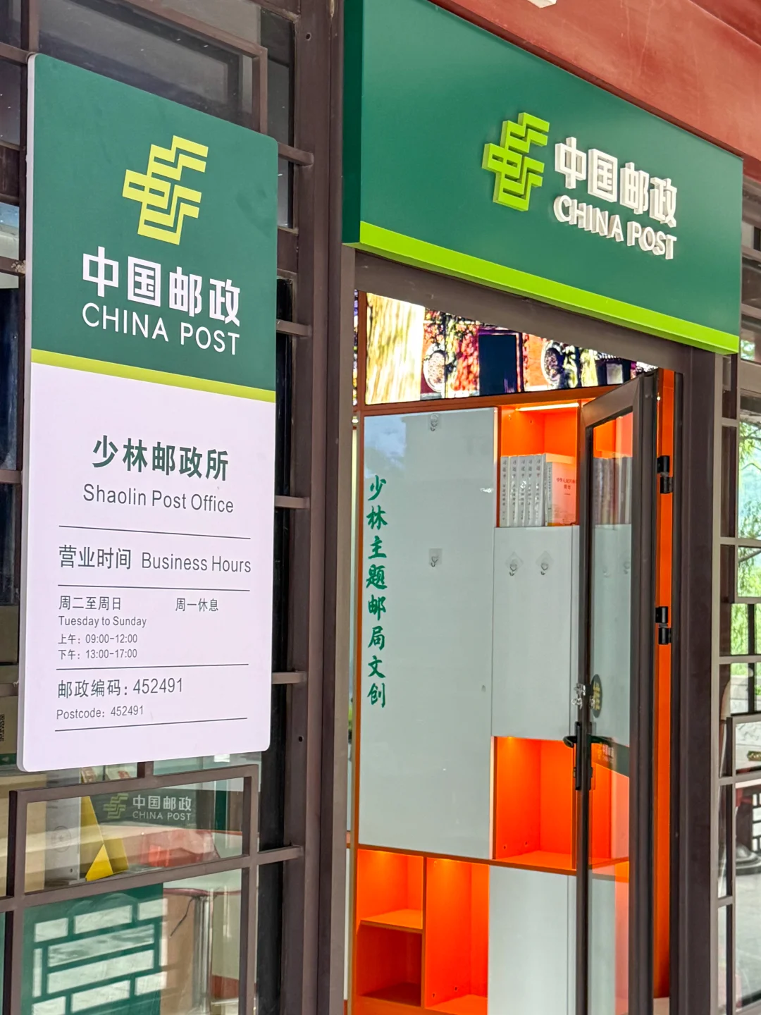 五岳里最便宜的明信片~ [向右R]嵩山少林邮局的位置 →图3少林牌坊位置=游客商业广场 →在停车场和少林景区检票口之间 →所有游客的必经之处 ✔️邮局不大,明信片好像只有两种 ✔️10元/套/内含9张,其中1张含邮资 😂折合1块钱1张~~良心价 ➕可以盖少林寺限定章,章也有两种 ▫️一种是十八罗汉 ▫️一种是十二生肖 ✅写完后门口邮筒直接投寄 ‼️邮局周一不开门营业