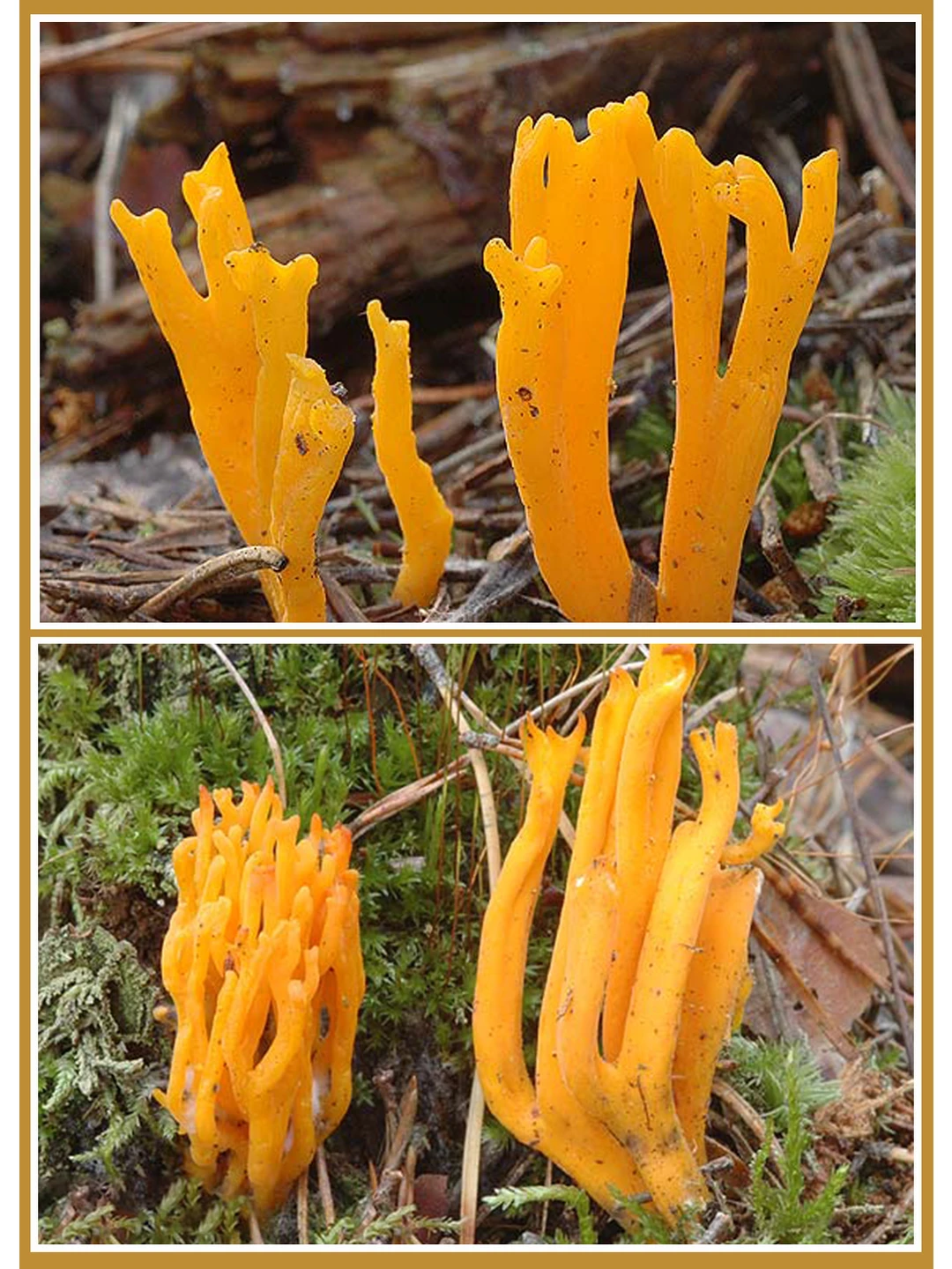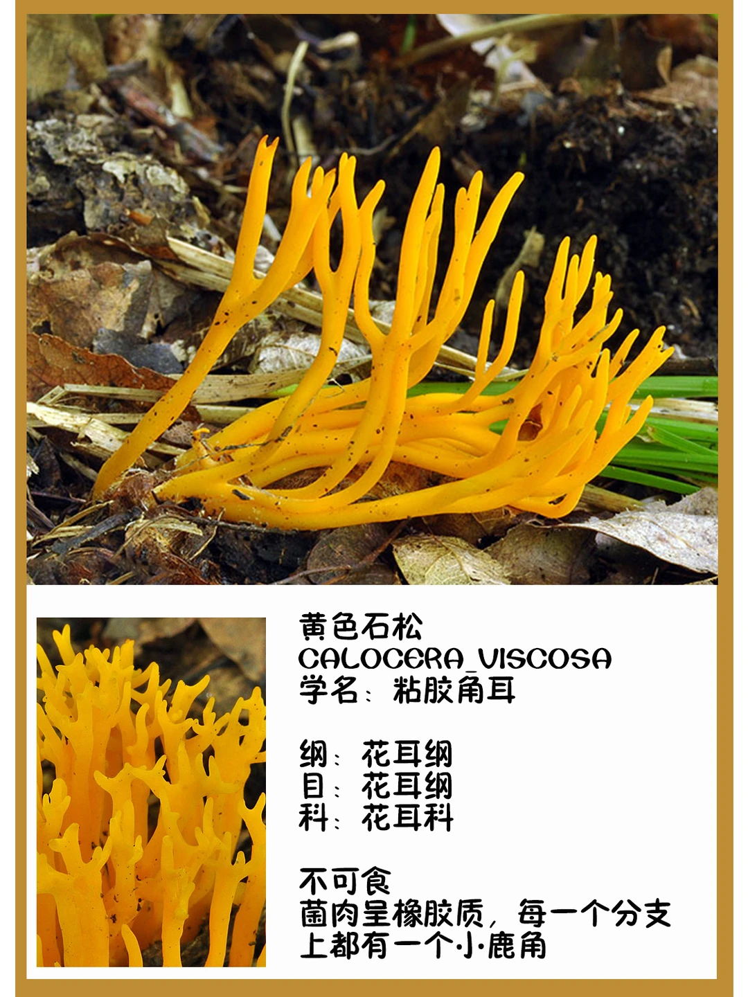黄色石松 calocera_viscosa 学名:粘胶角耳 纲:花耳纲 目:花耳纲 科:花耳科 图片©manatarka.org ©josef hlasek [石化R]不可食 菌肉呈橡胶质,每一个分支上都有一个小鹿角