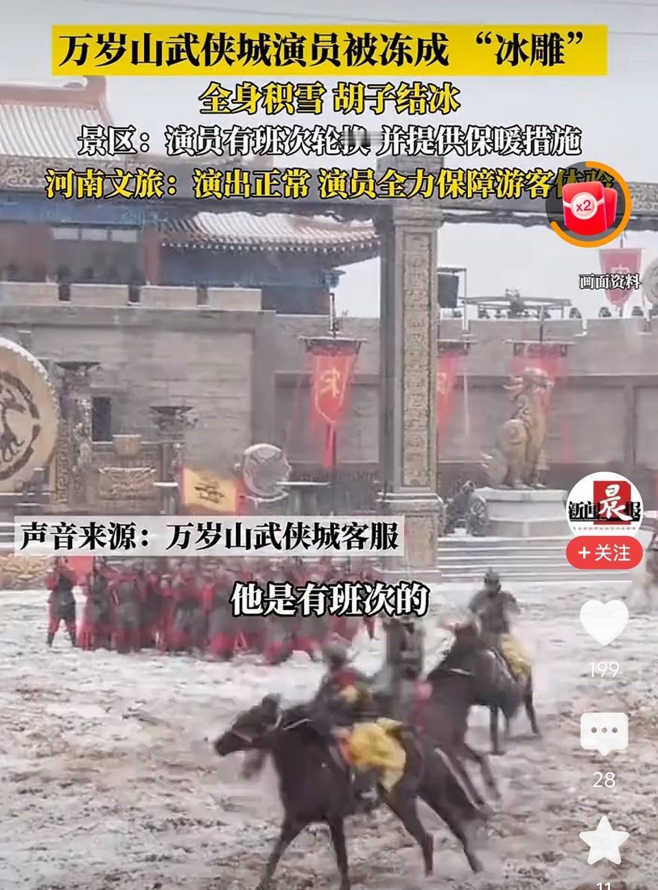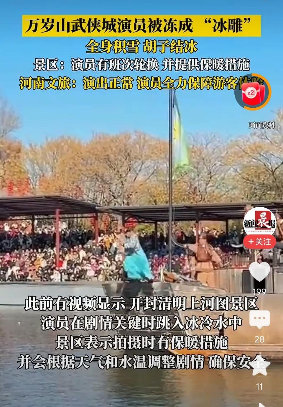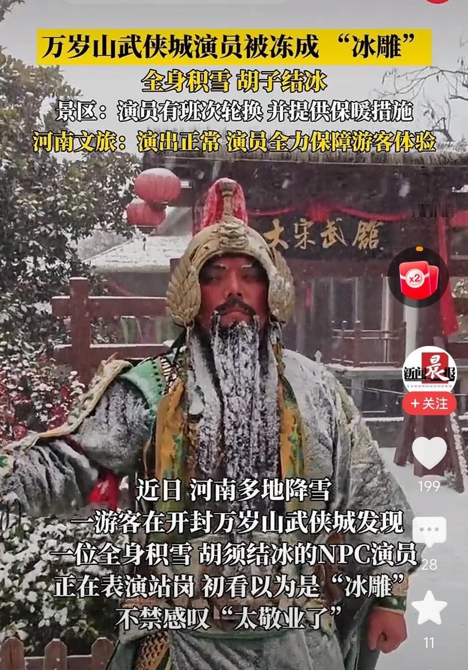 万岁山武侠城演员被冻成"冰雕",全身 积雪,胡子结冰,景区表示:演员有班次轮换,并提供保暖措施。 将心比心,难道这么冷的天,不去表演那些跳水或者太冷的项目不可以吗? 要说这个武将的演员,这衣服挺厚的还有帽子,还是可以坚持的,跳水那个太过分了!这冰天雪地还要跳水? 这个项目这么冷的天就停了吧,演员也是人啊,冻坏了咋办? 别的地方还好说,关键是没带手套,这大雪天儿,可真不是一般的敬业! 唉!身上未有千斤担,谁愿把命做雪山?都是牛马! 如果真的项目不能停,那就戴上手套吧,别给冻着了,身体健康要紧!游客们都理解!