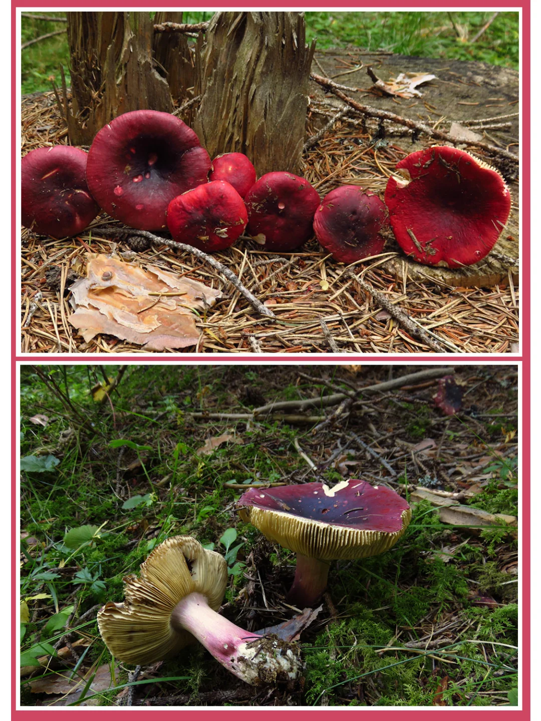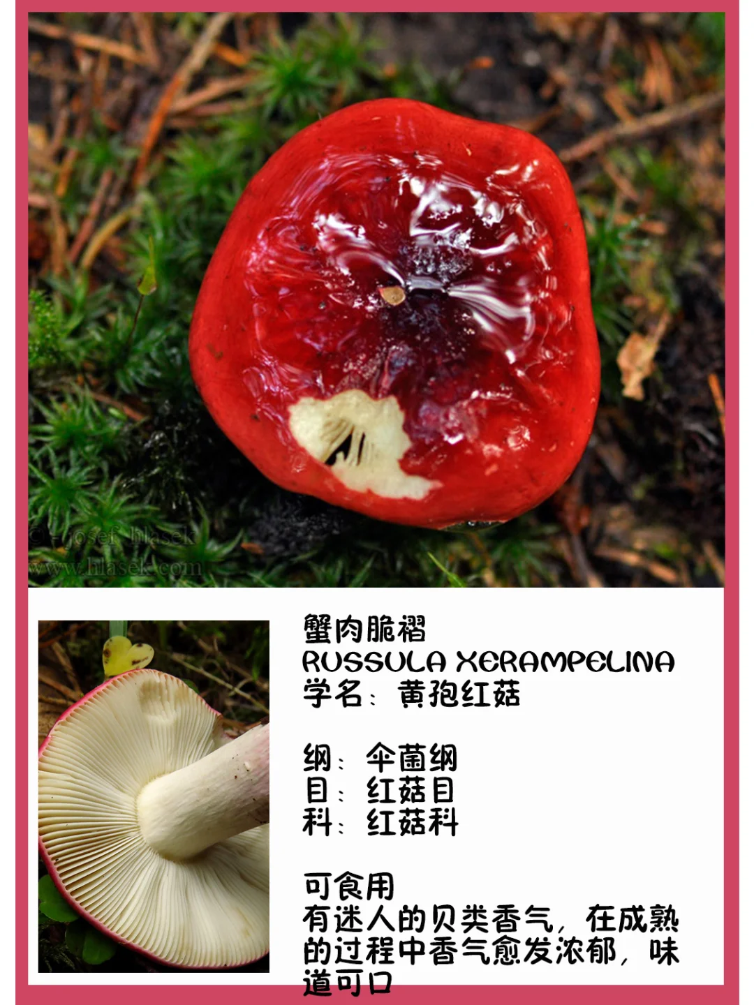 蟹肉脆褶 russula xerampelina 学名:黄孢红菇 纲:伞菌纲 目:红菇目 科:红菇科 图片©josef hlasek©manatarka.org 可食用 有迷人的贝类香气,在成熟的过程中香气愈发浓郁,味道可口[萌萌哒R] 菌柄常有锈色斑点,老后通体变成褐色