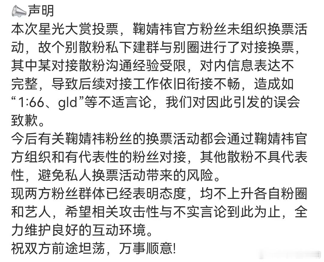 鞠婧祎粉丝和光毛就星光大赏和超话大赏换票一事发声明了:已沟通好。已建群还清票并规