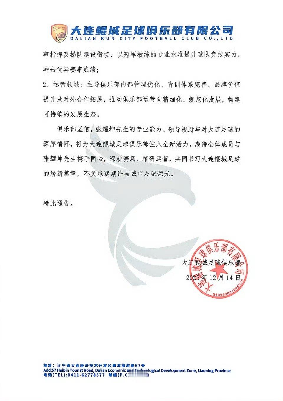 张耀坤出任大连鲲城足球俱乐部总经理兼主帅