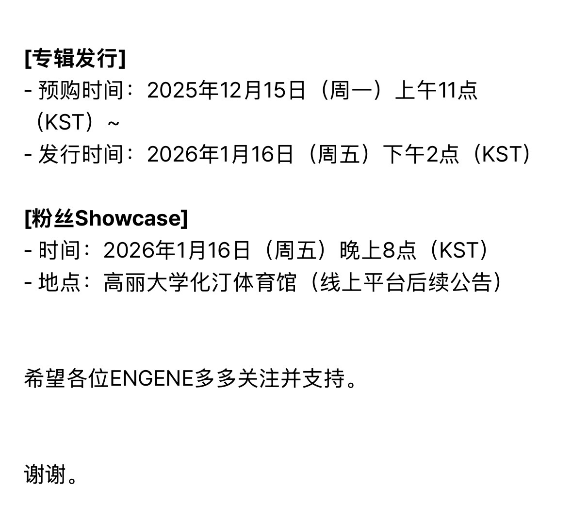 ENHYPEN官宣将于2026年1月16日发行迷你7辑《THE SIN : VANISH》并举办粉丝Showcase