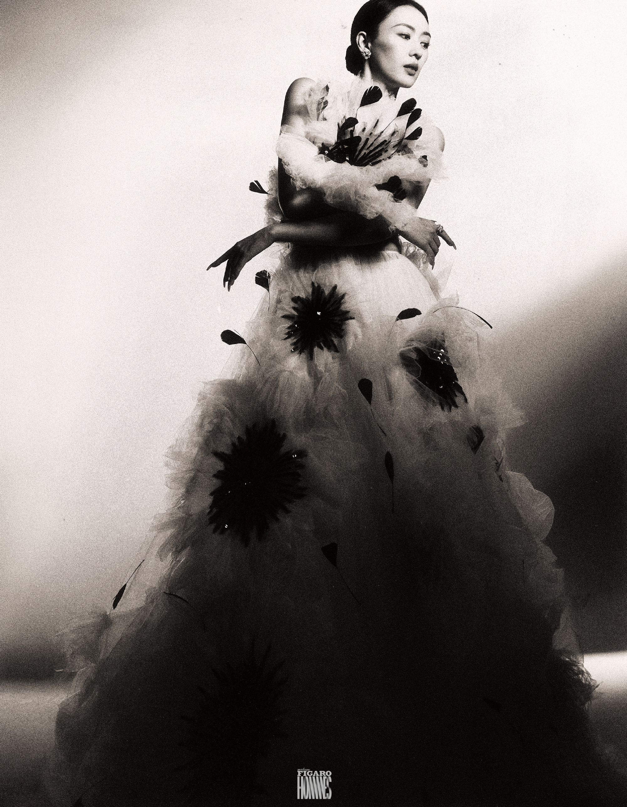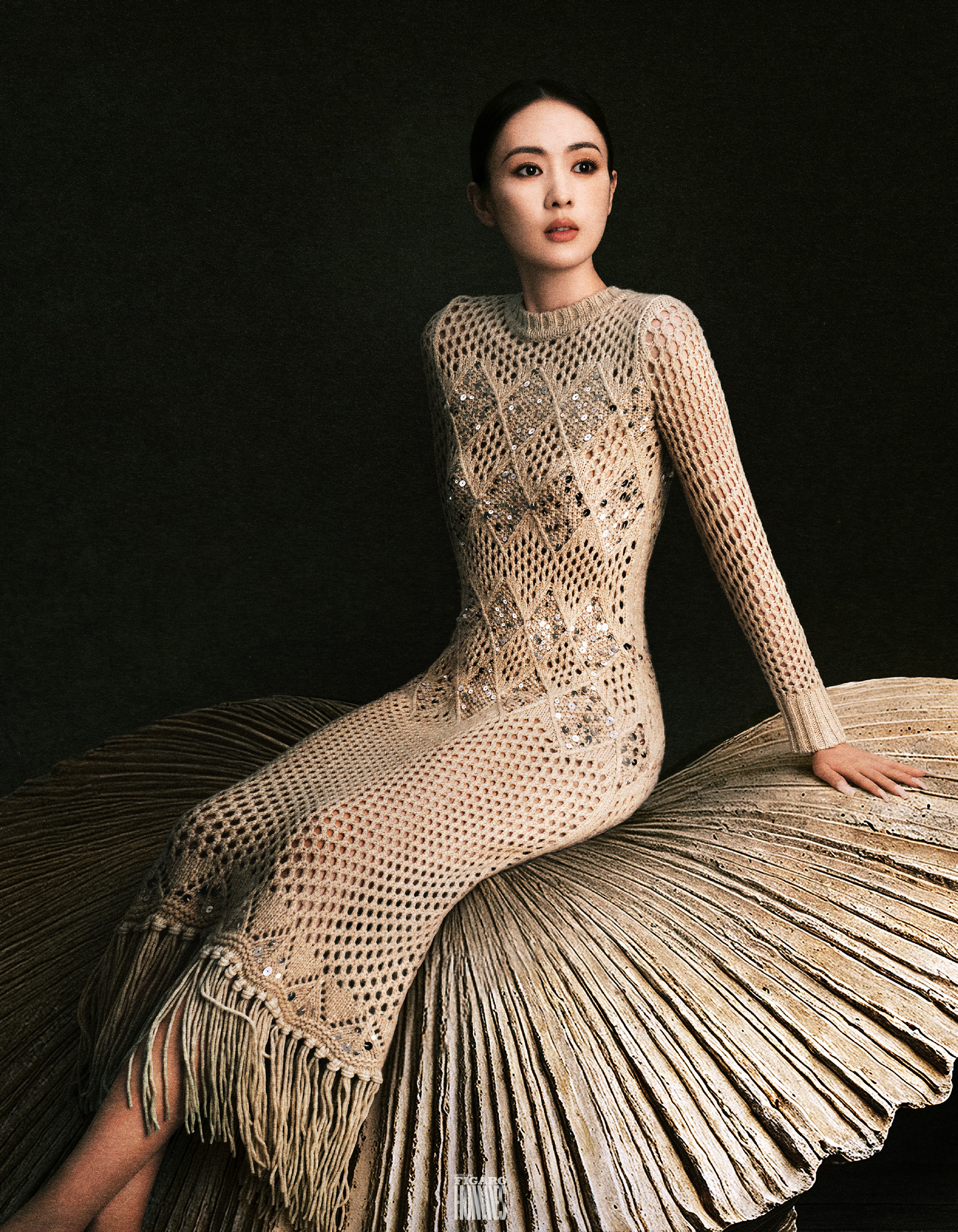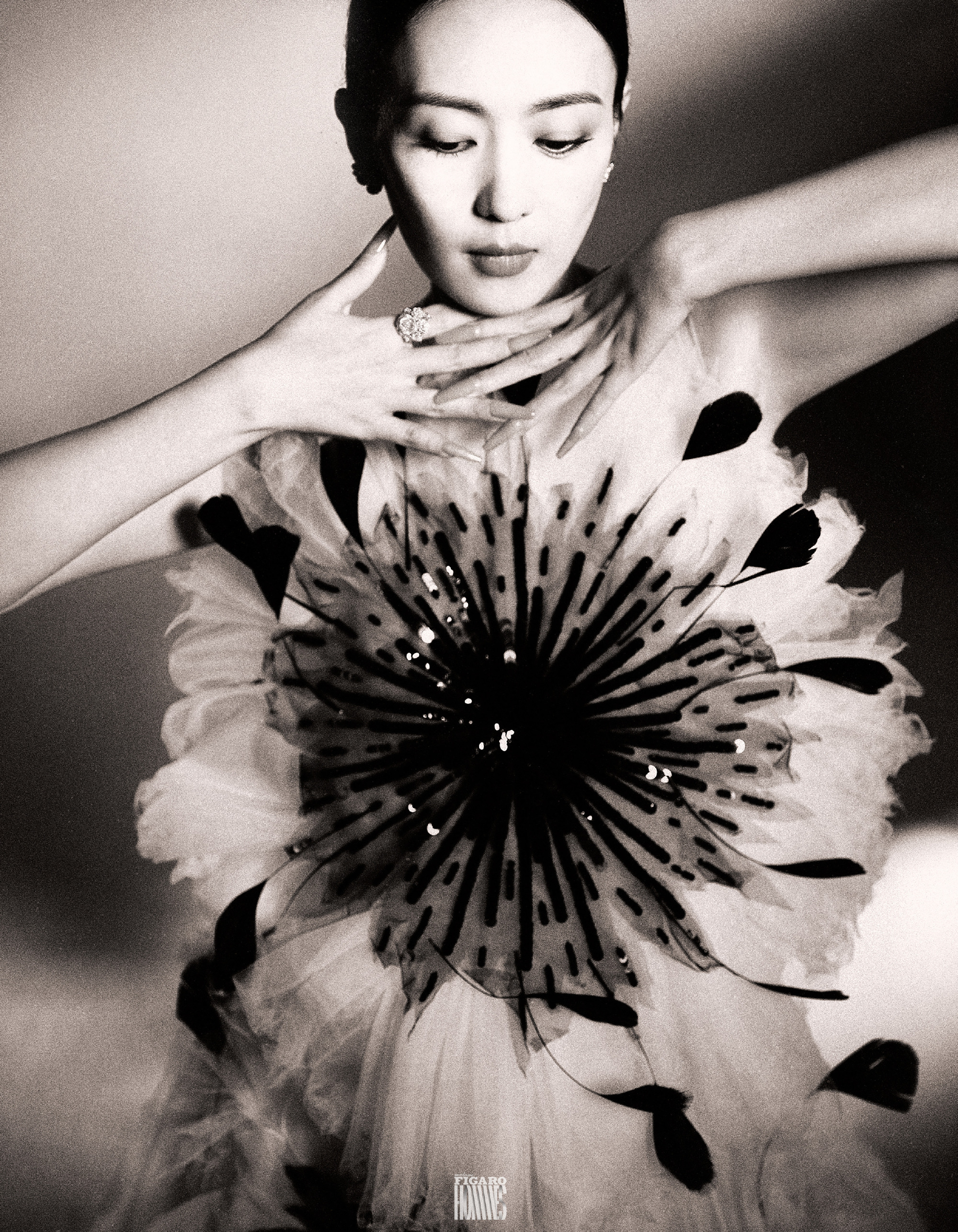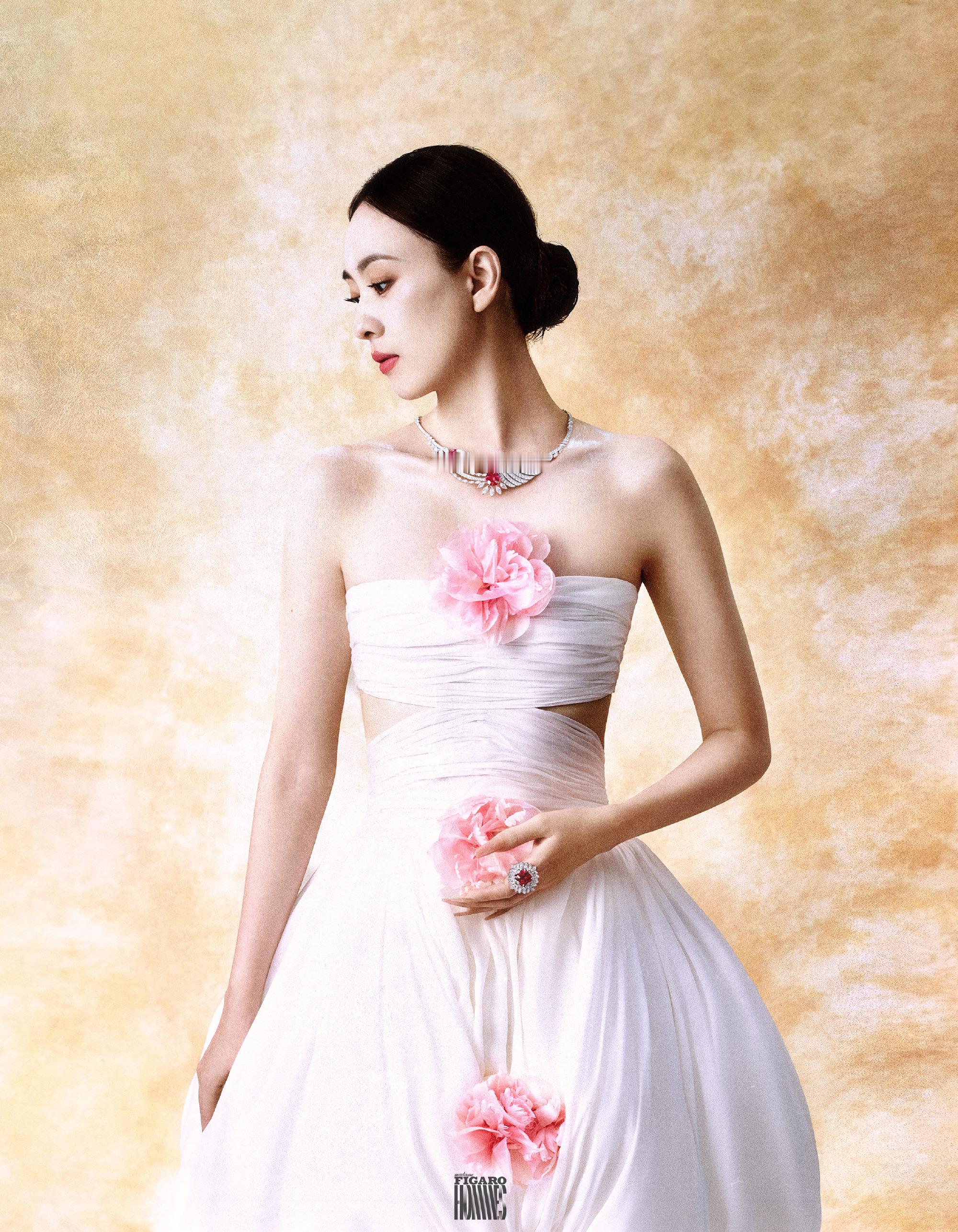 童瑶费加罗男士十月刊封面流纱花苞裙大片。童瑶