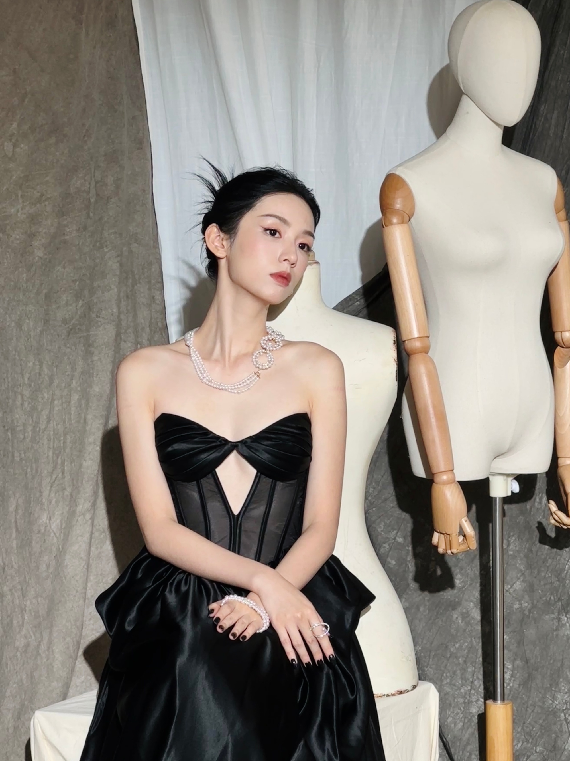 【马伊琍这组黑裙写真,媚得好高级!】黑缎面抹胸裙一穿,直角肩、一字锁骨直接杀疯