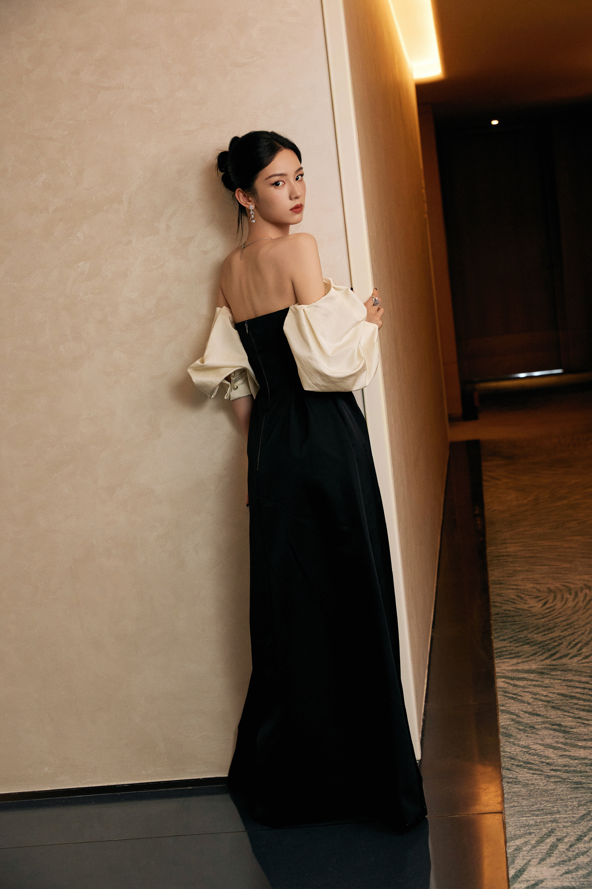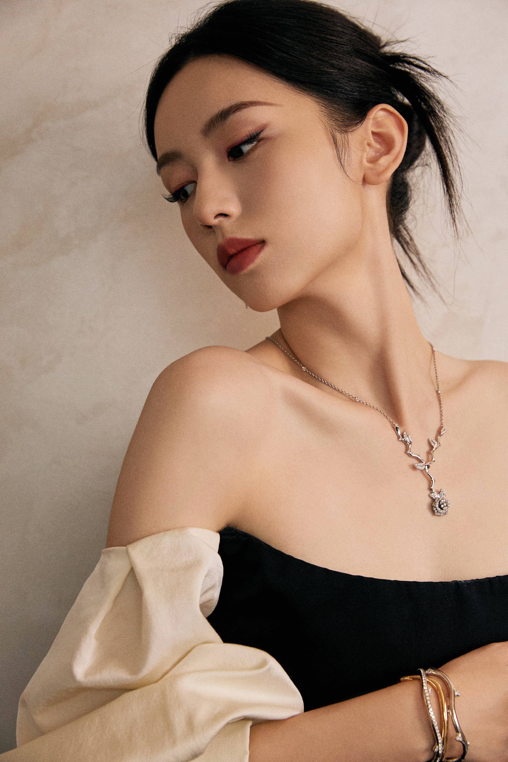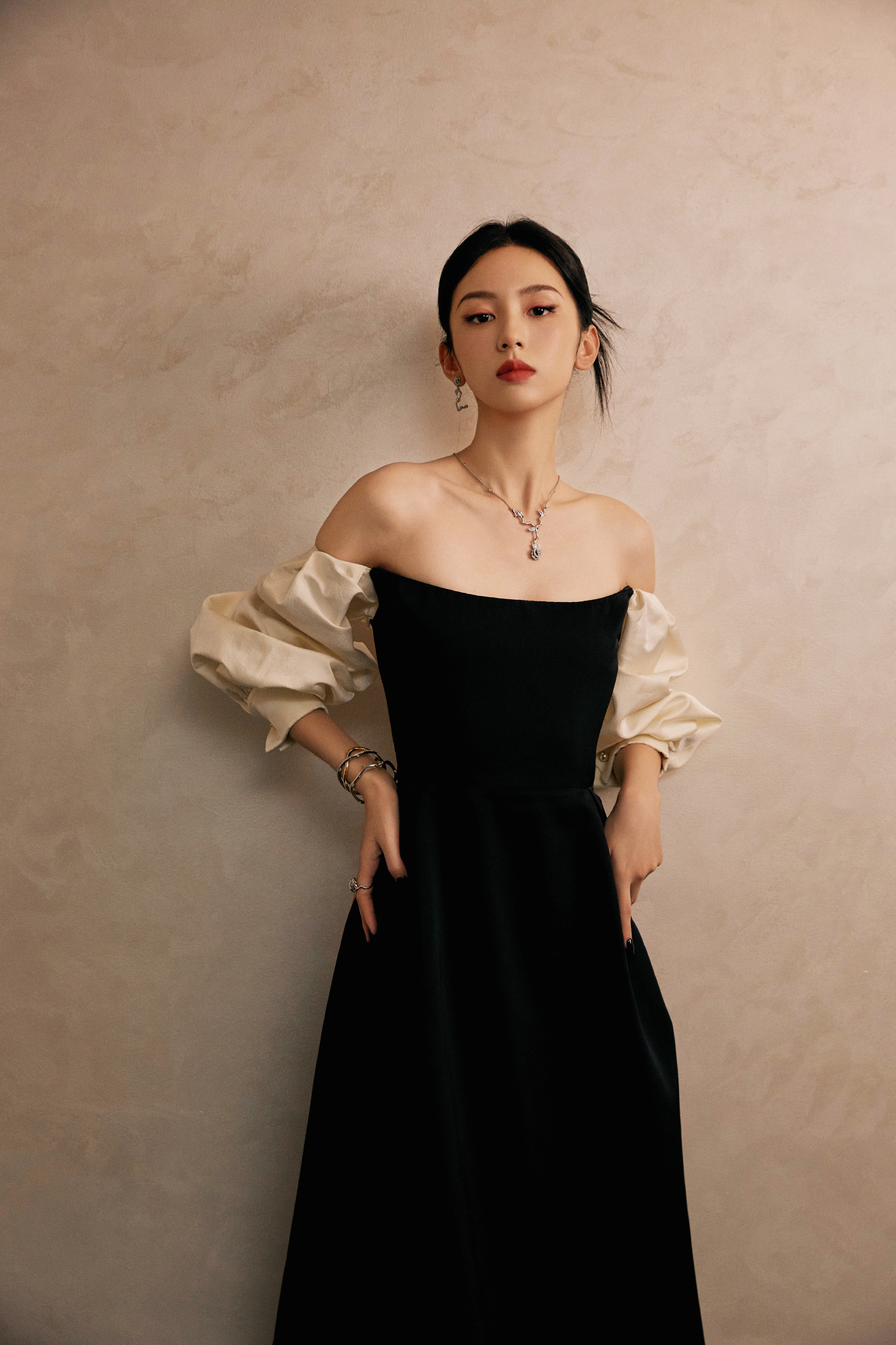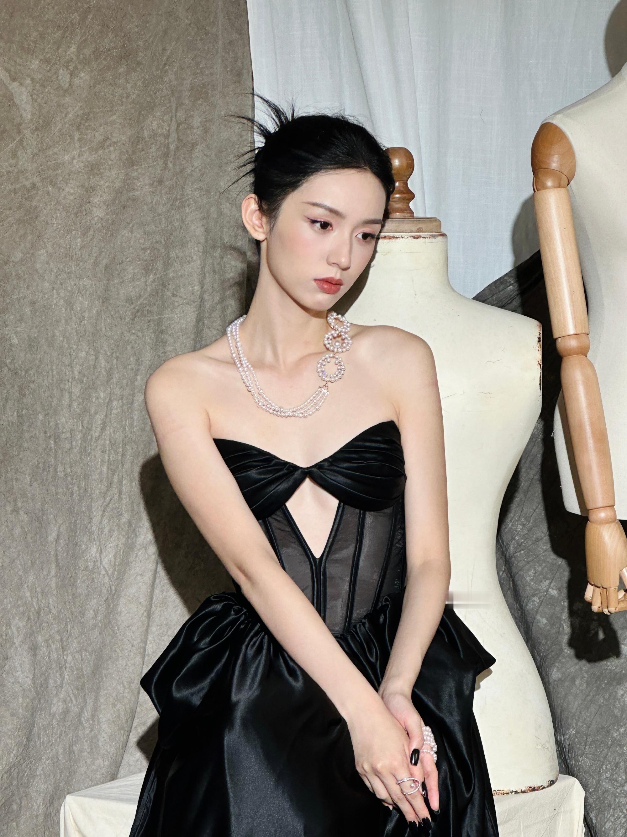 周也,黑色抹胸裙,冷脸美人,时尚感满满。周也
